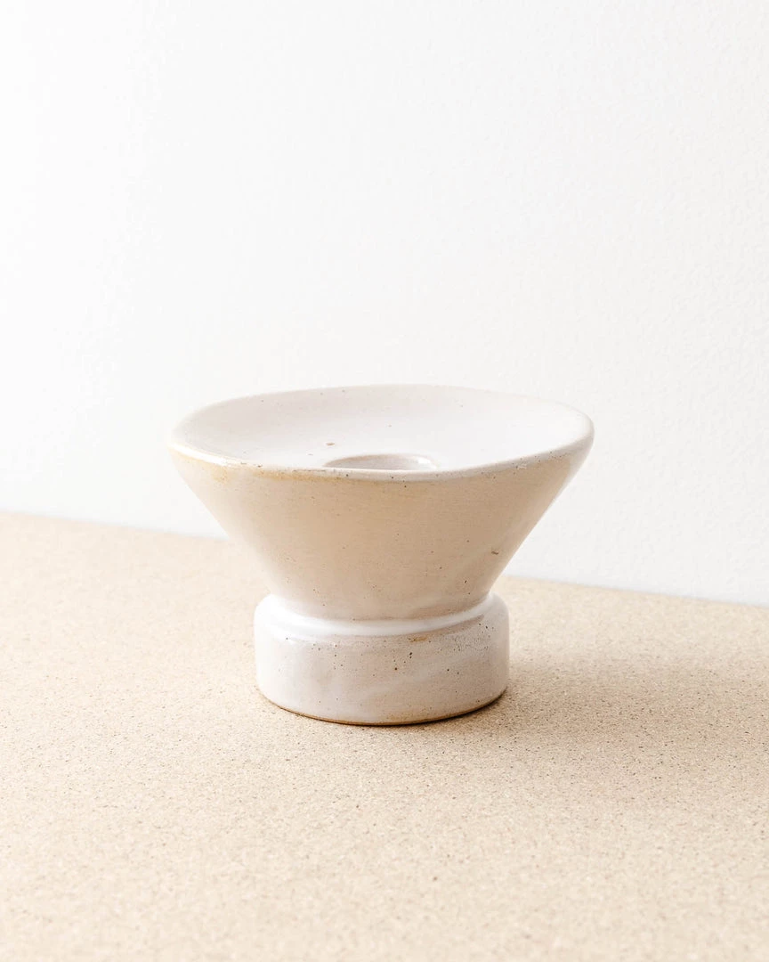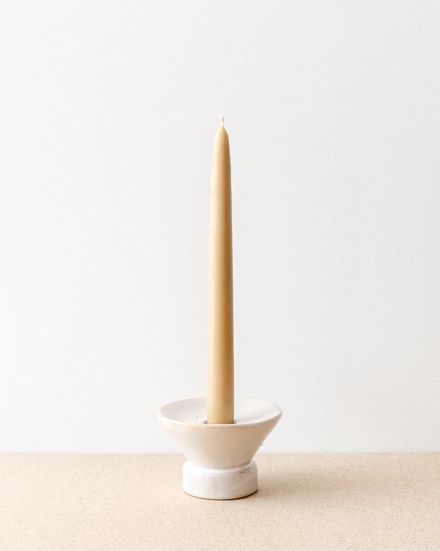The Polly chunky taper holder lends a simplistic silhouette to your table or mantle. Finished with a smooth glaze that shares some of the natural color from the speckled ceramic.