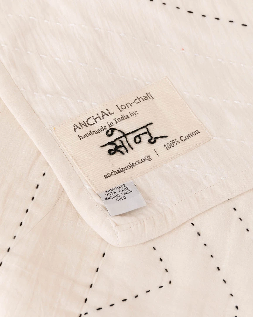 Made by women artisans in India (who are provided with a full-time job, health care benefits, design training, and educational workshops), each quilt is hand-stitched with the artisan’s name.