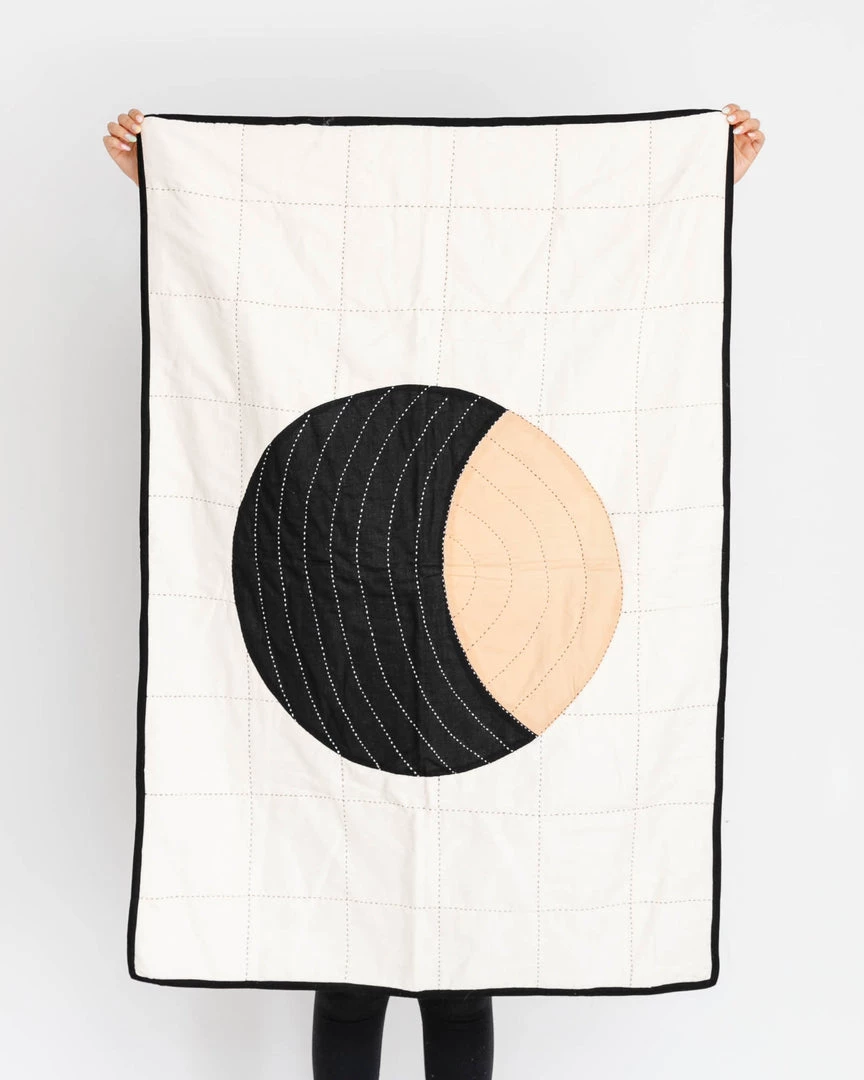 Featuring a hand-stitched circular geometric composition with a timeless color palette, this small organic cotton quilt is sure to make a statement in any room.