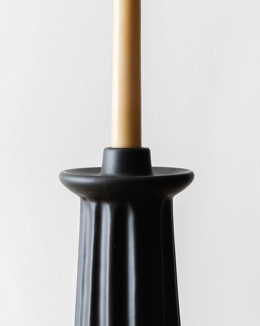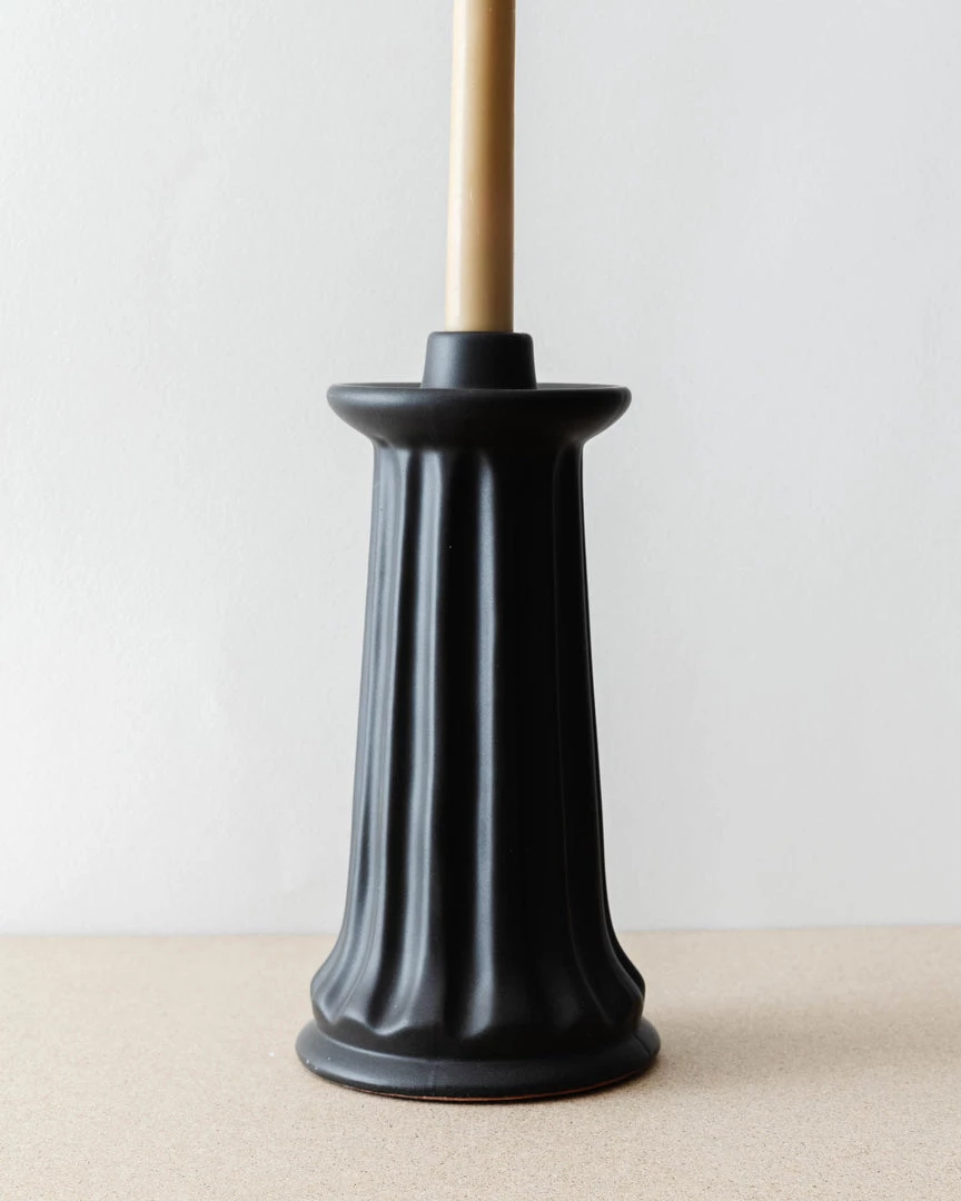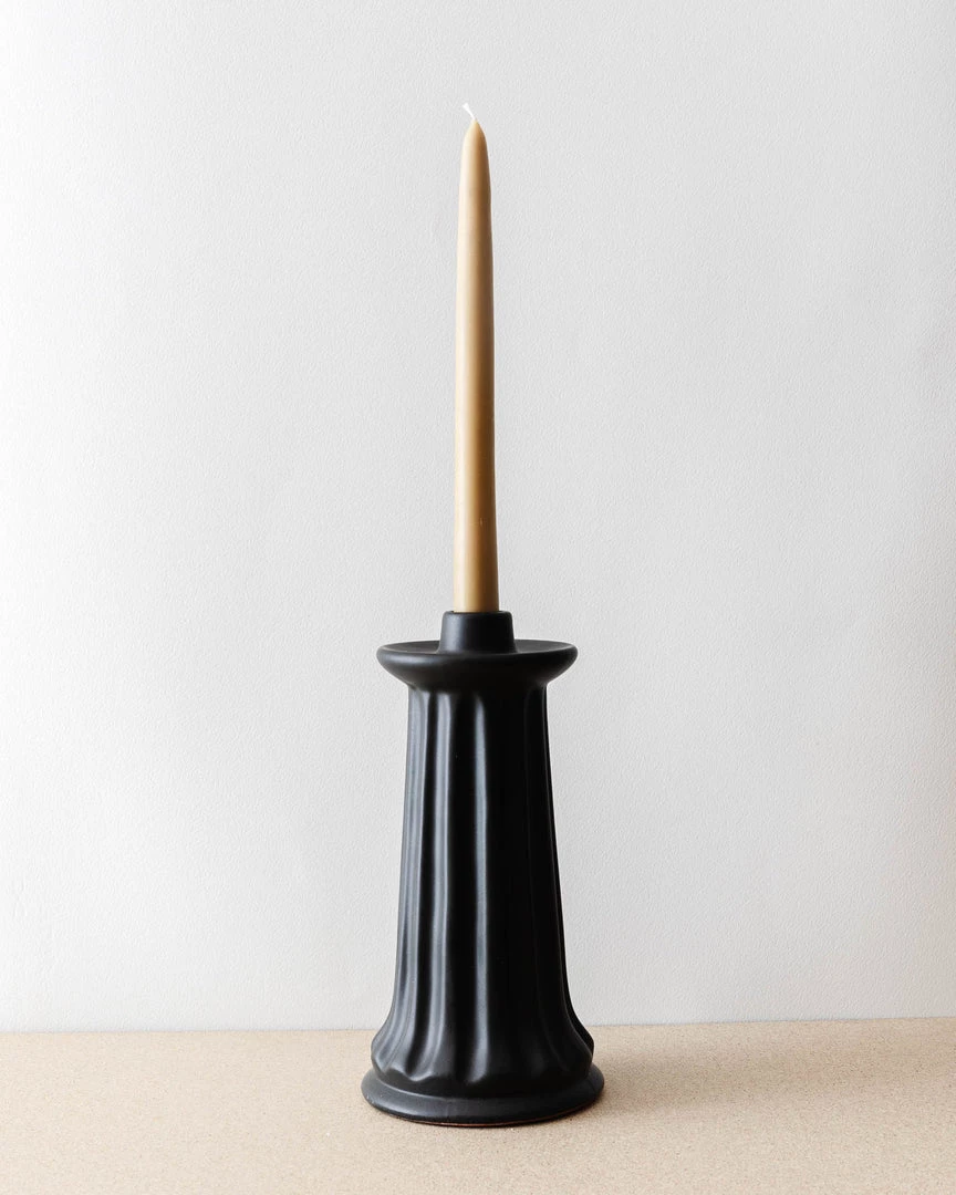 This bold and modish embossed terracotta taper holder is a striking accent for any home.