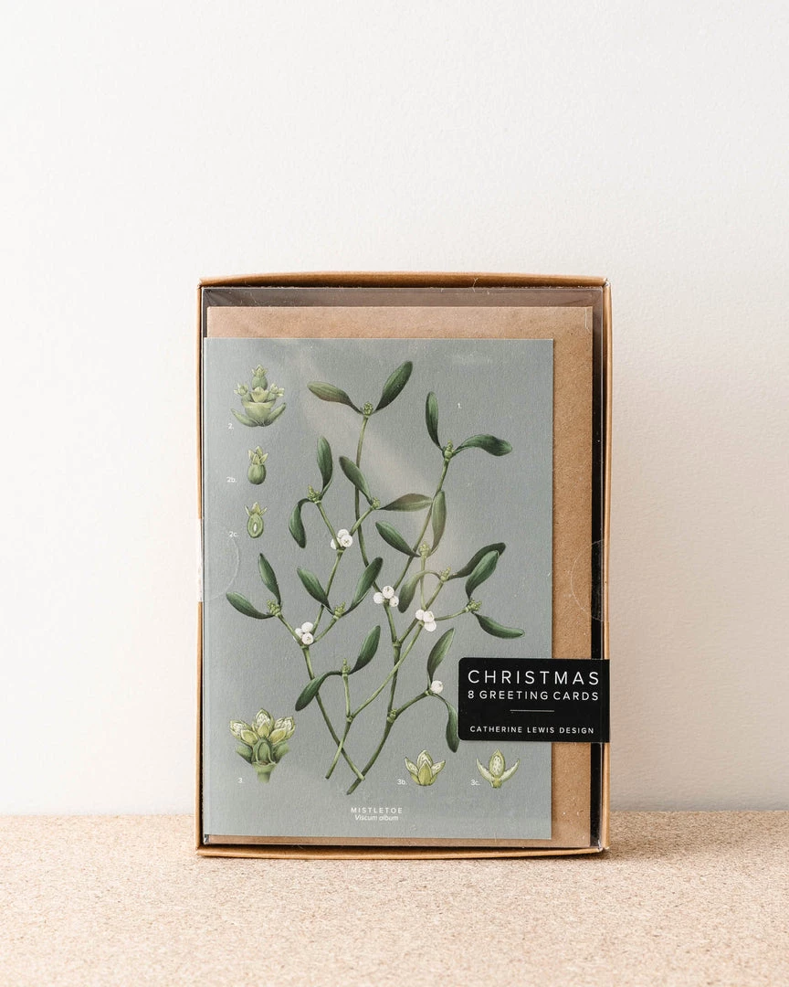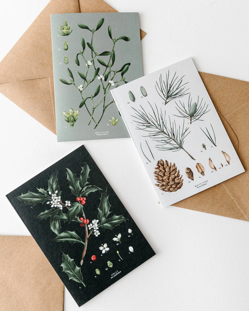 A pack of 8 intricately drawn luxury Christmas blank greeting cards with illustrations of festive plants from the ‘Greenery Collection’ by Catherine Lewis Design.