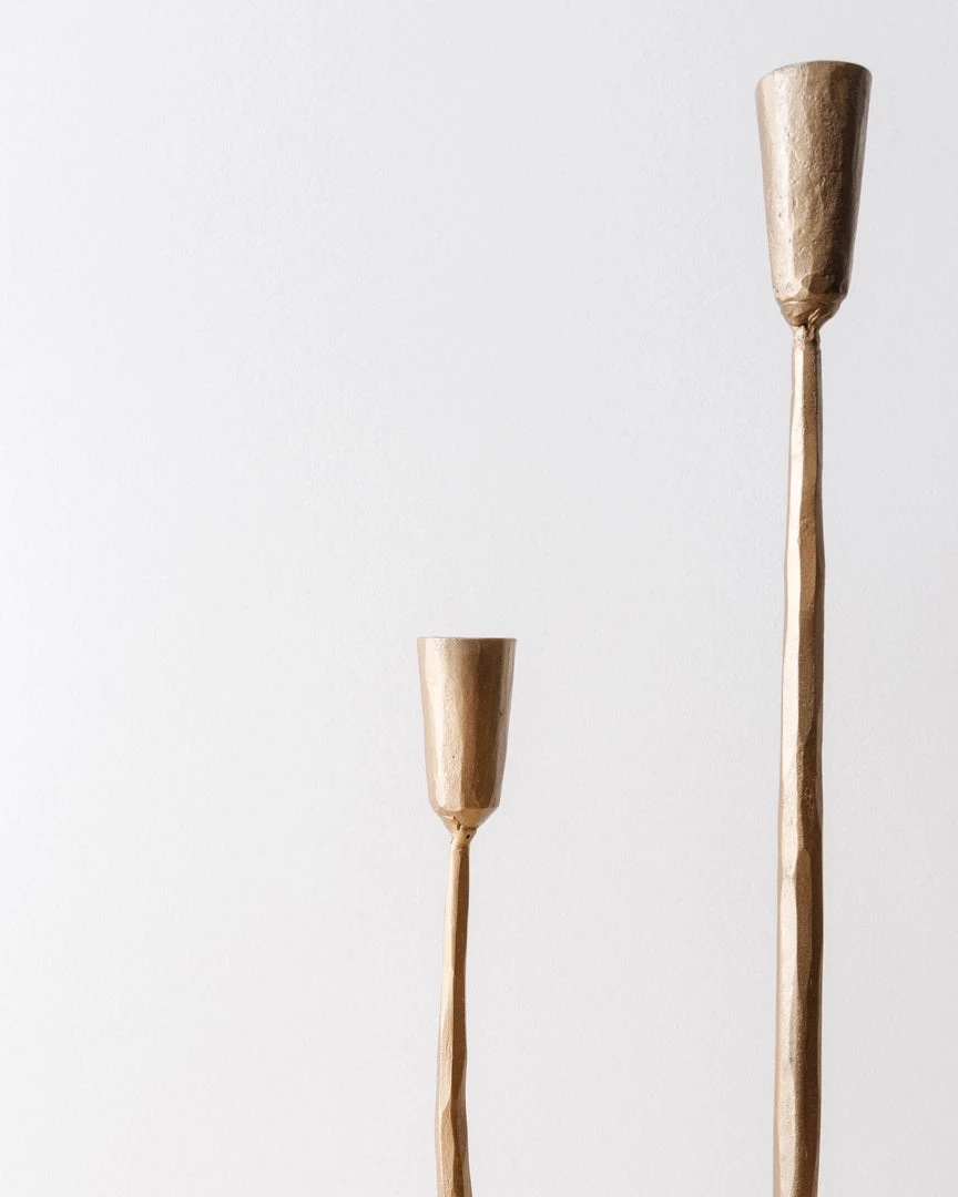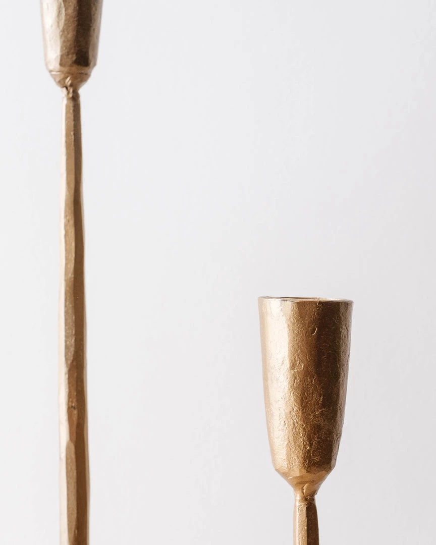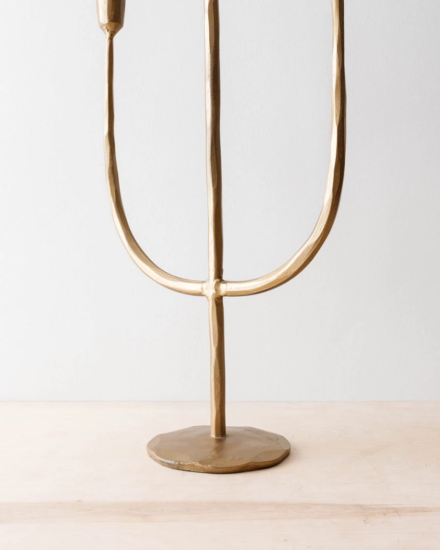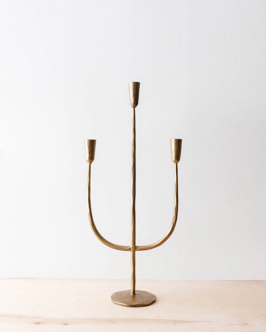 Stylishly designed, this hand-forged, hammered metal candelabra has an antique brass finish. Display with similar complementary pieces or as a stand-alone statement piece.