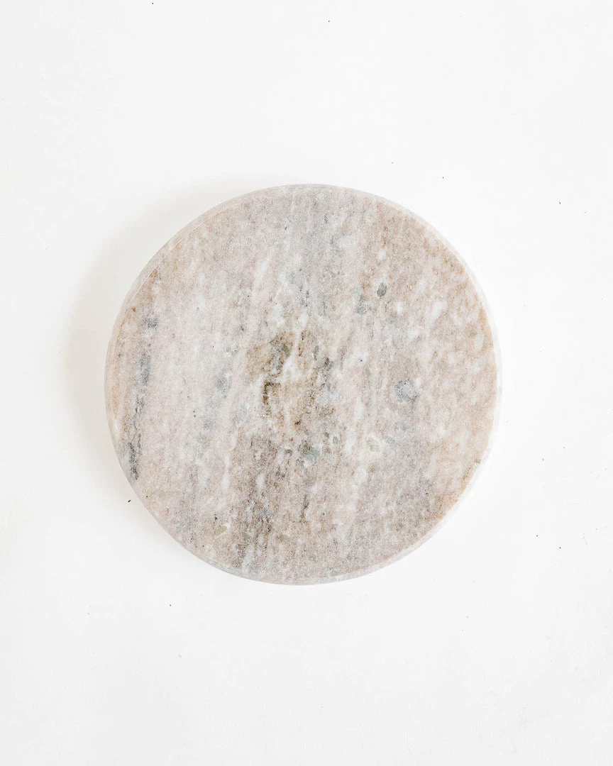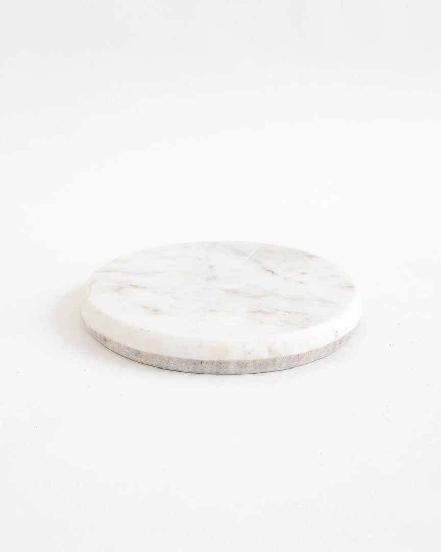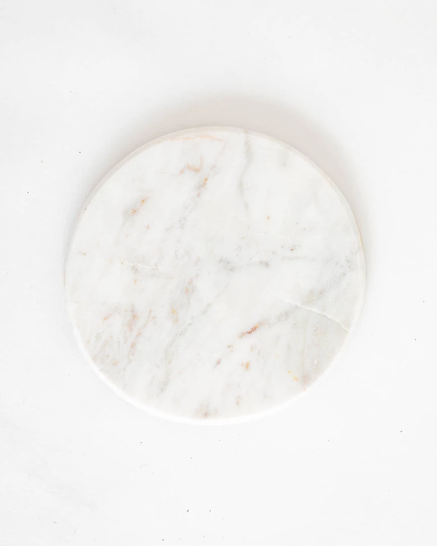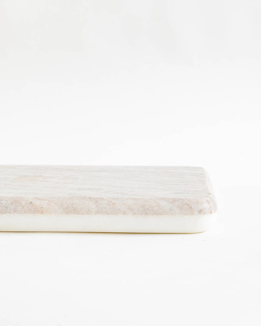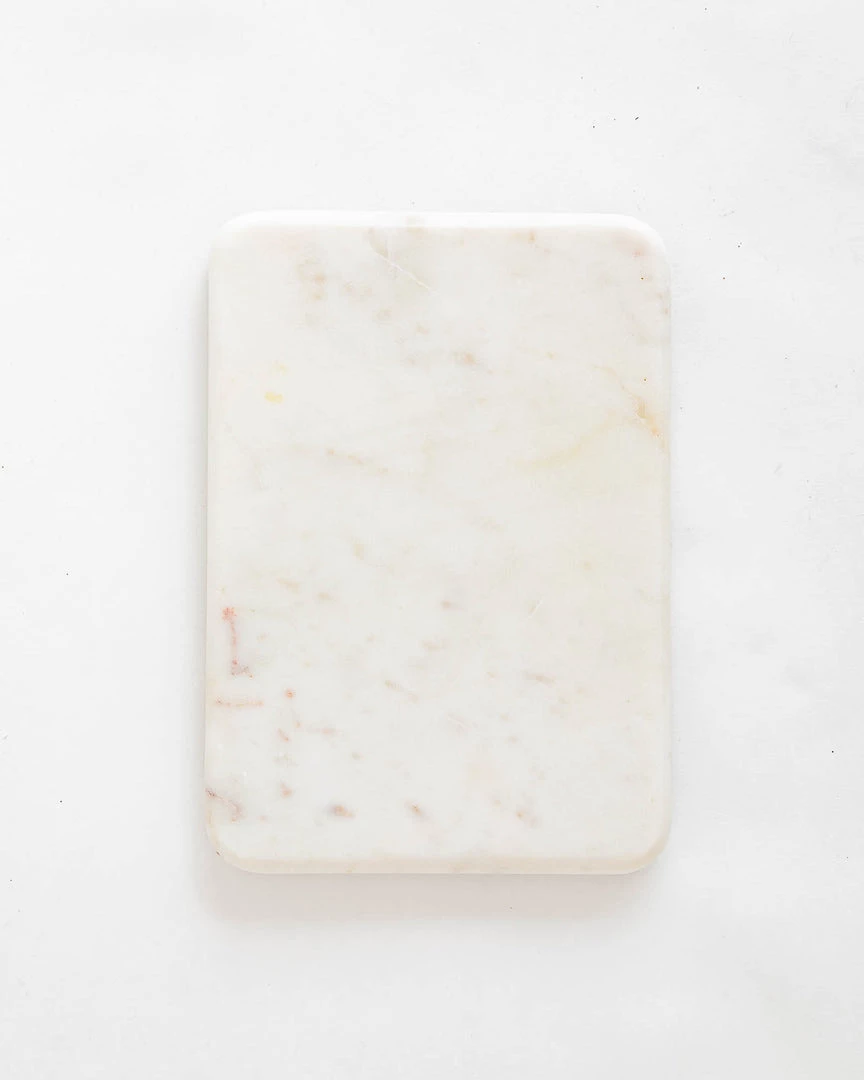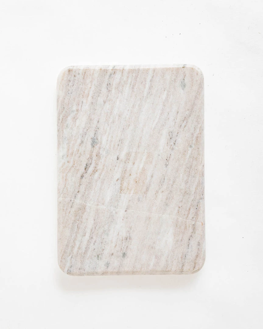 This reversible white marble cutting board is a sophisticated kitchen addition for the home. It provides a stunning foundation for cheeses and charcuterie.
