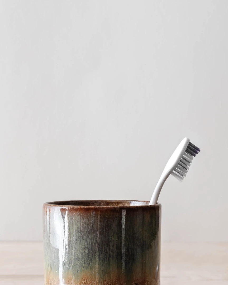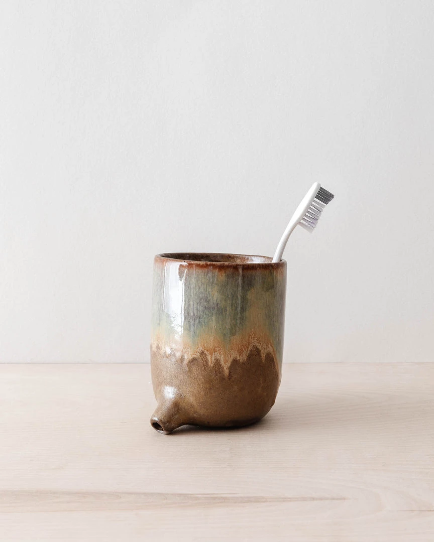 Hold a toothbrush or sponge in style. The perfect addition to any kitchen or bathroom with a spout to drain excess water.