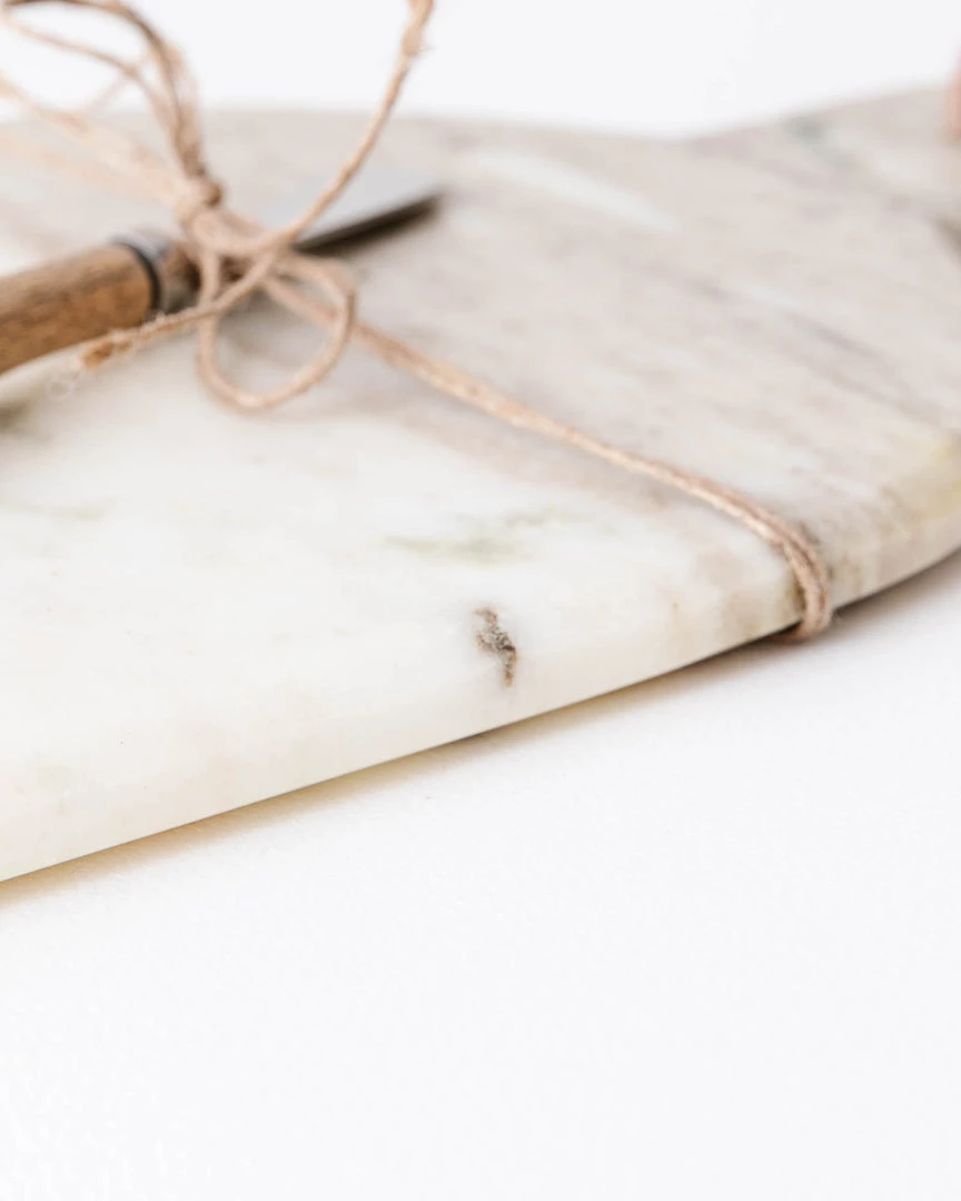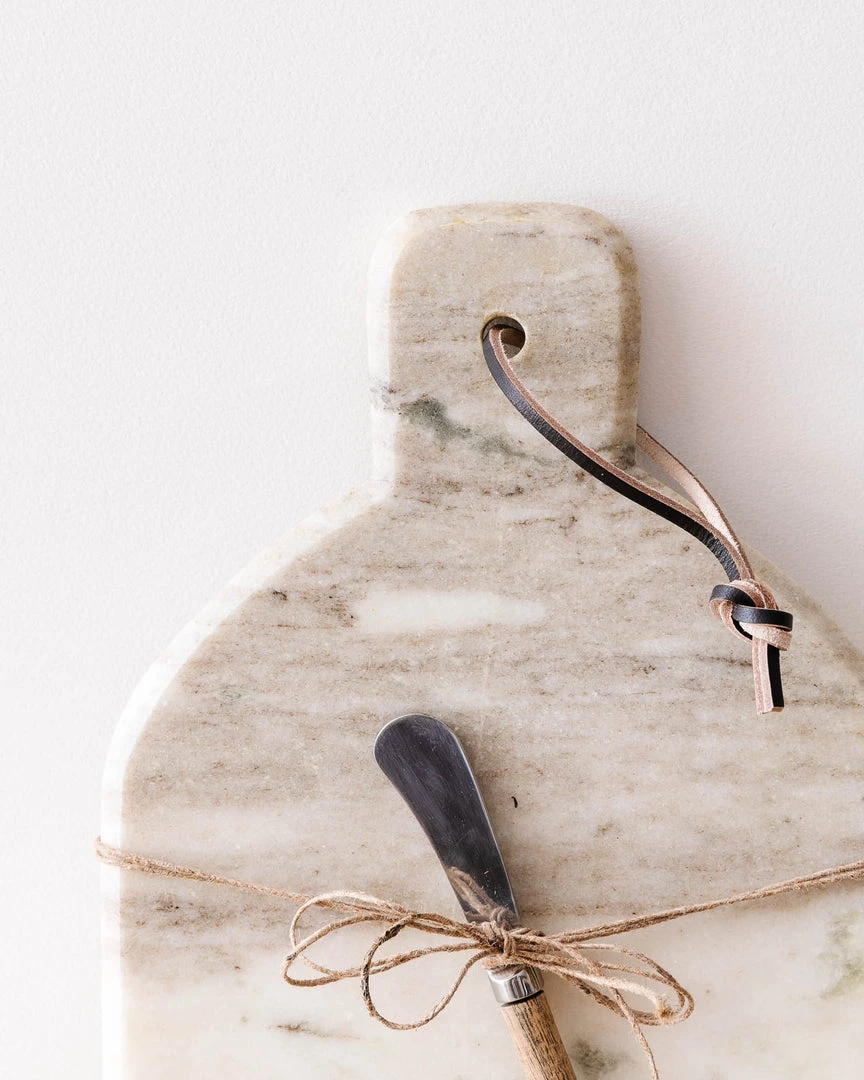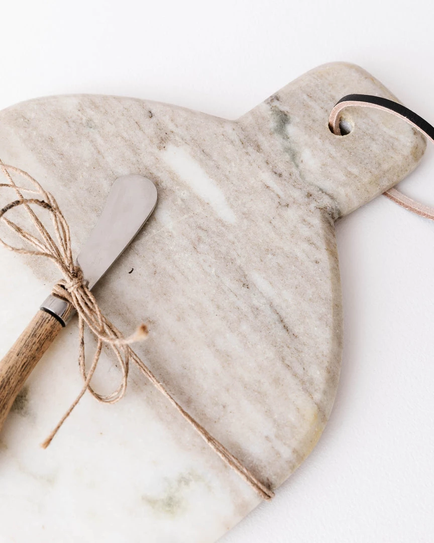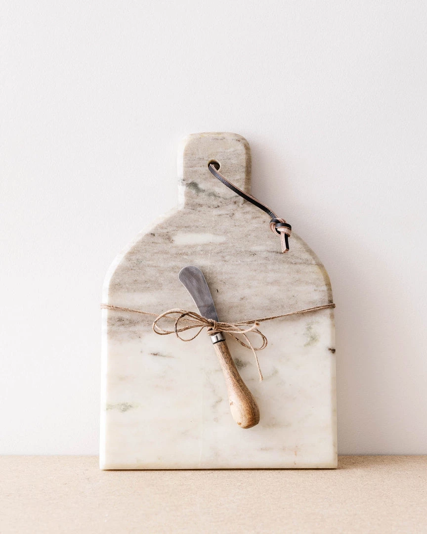 This marble cutting board is both sleek and classic. With a buff color, this neutral piece fits seamlessly into any modern home and will add sophistication to any kitchen setup. It comes with a canape knife.