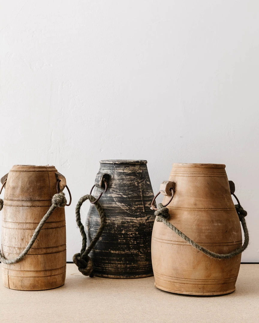 A vintage accent suitable for a variety of styles and uses. Can be used as a vessel for dried flowers or a standalone decorative object, they are sure to complement any space. Hand carved with natural imperfections. Style on a book case or mantle alongside books and a storage basket… just a thought!