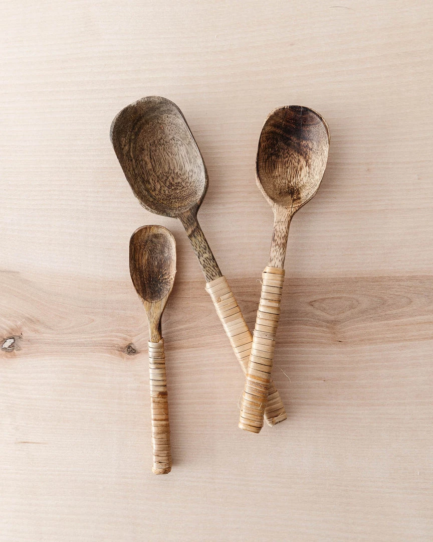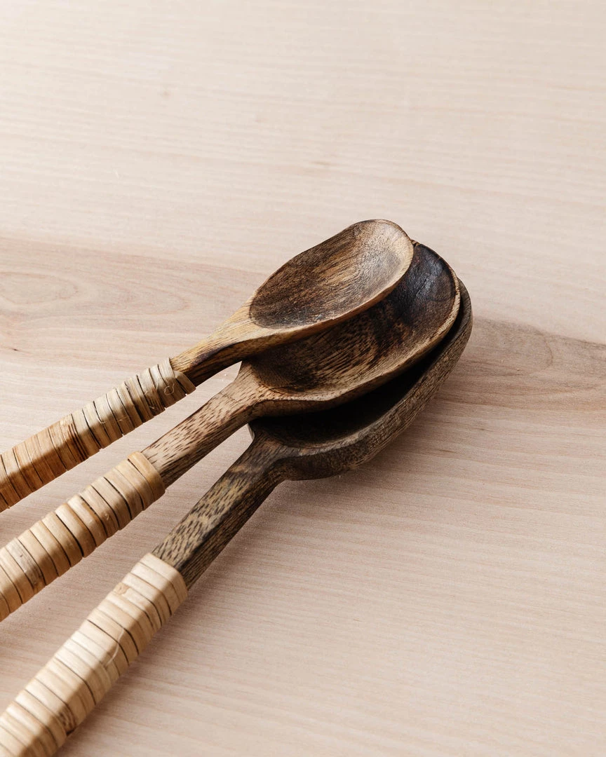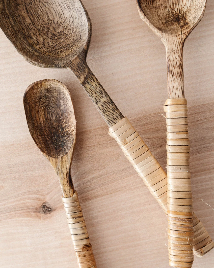 Add a beautiful touch to your tableware with these bamboo wrapped mango wood serving spoons. Perfect for sauces and toppings or used separately to bring a homey touch to an array of dishes.