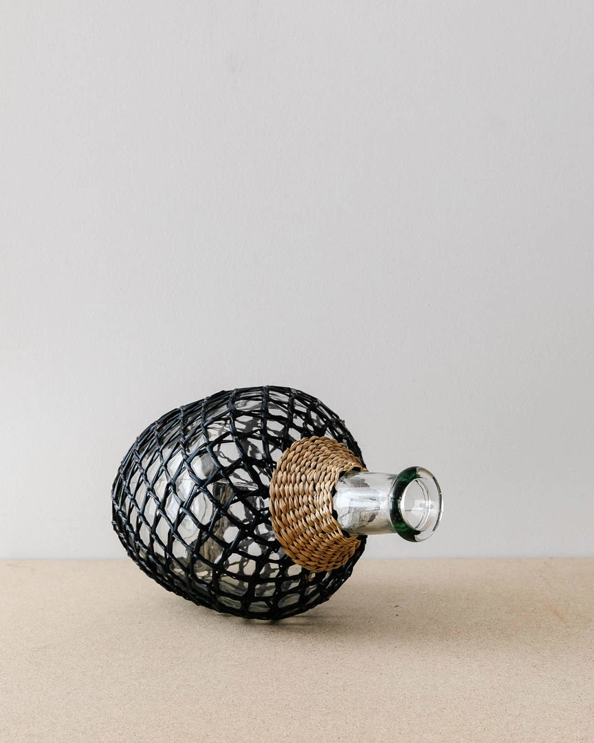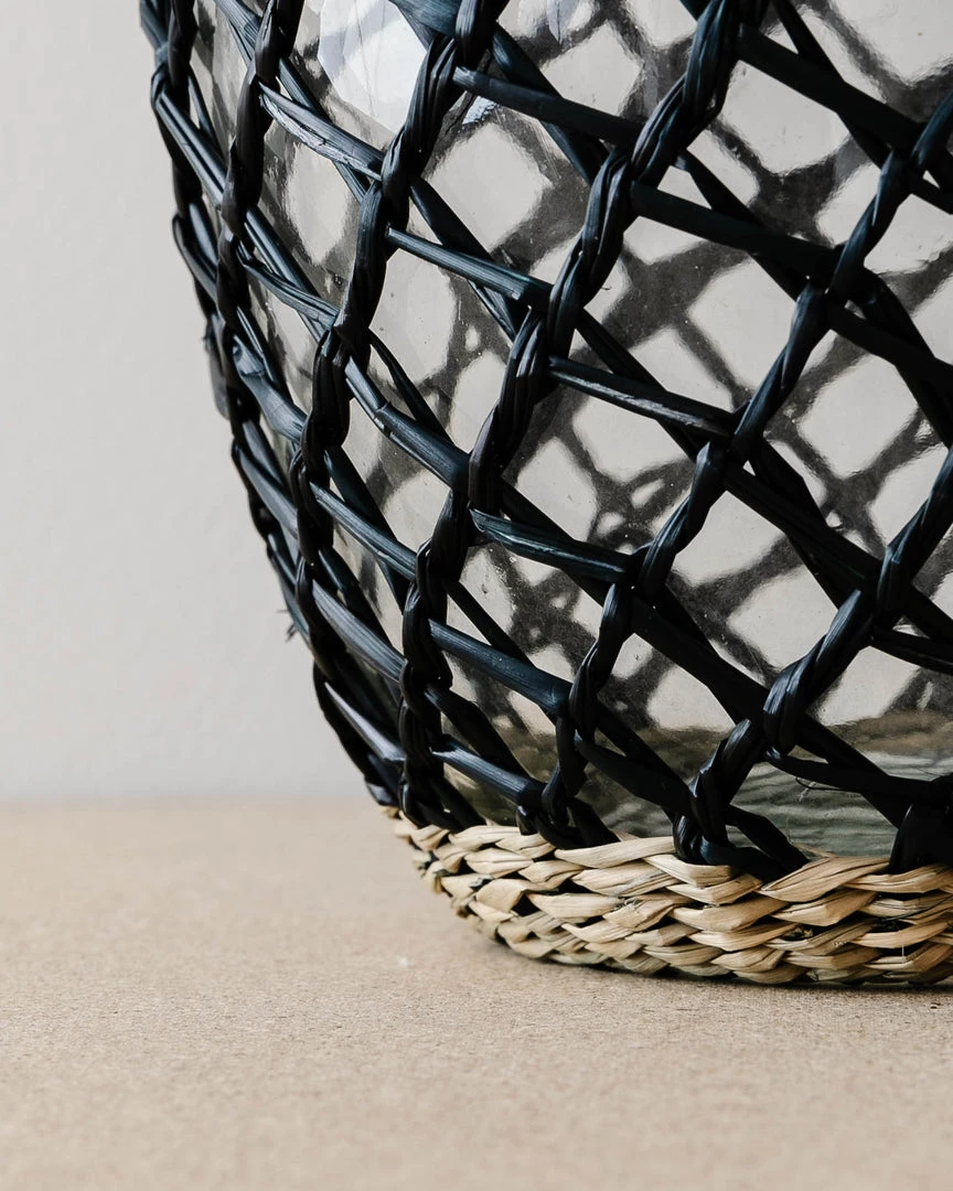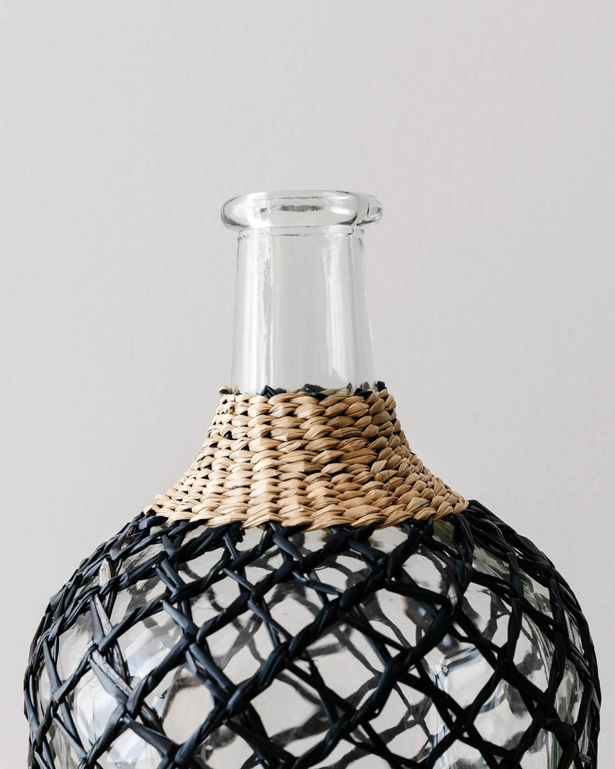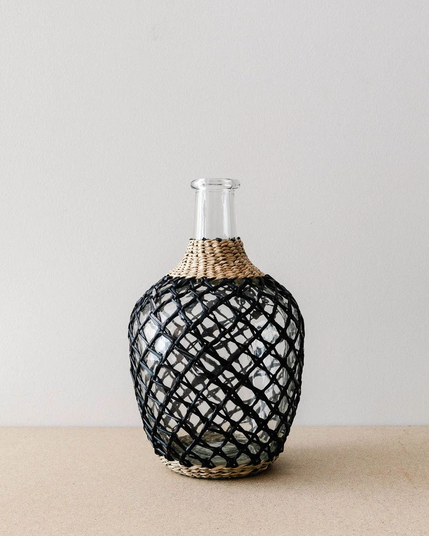 Add coastal charm to any room with this hand woven bottle. With both natural and black colors, this jar is perfect for displaying dried florals or small decorative accents