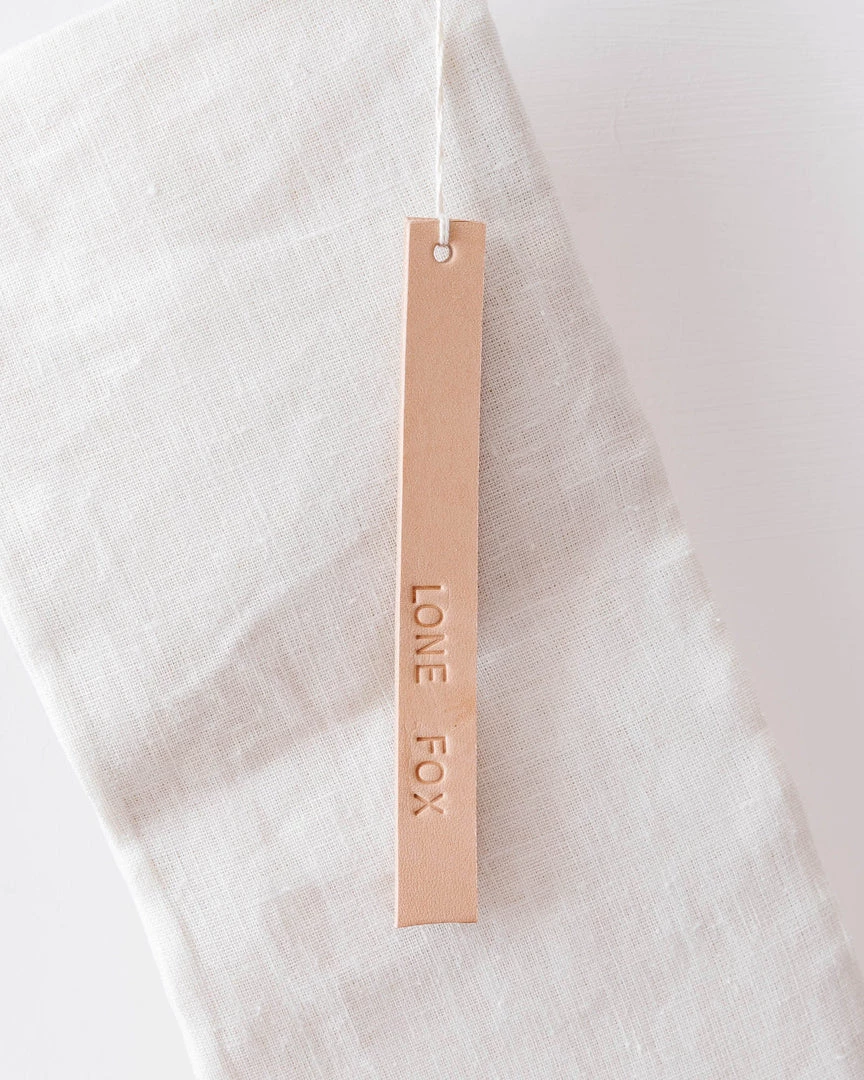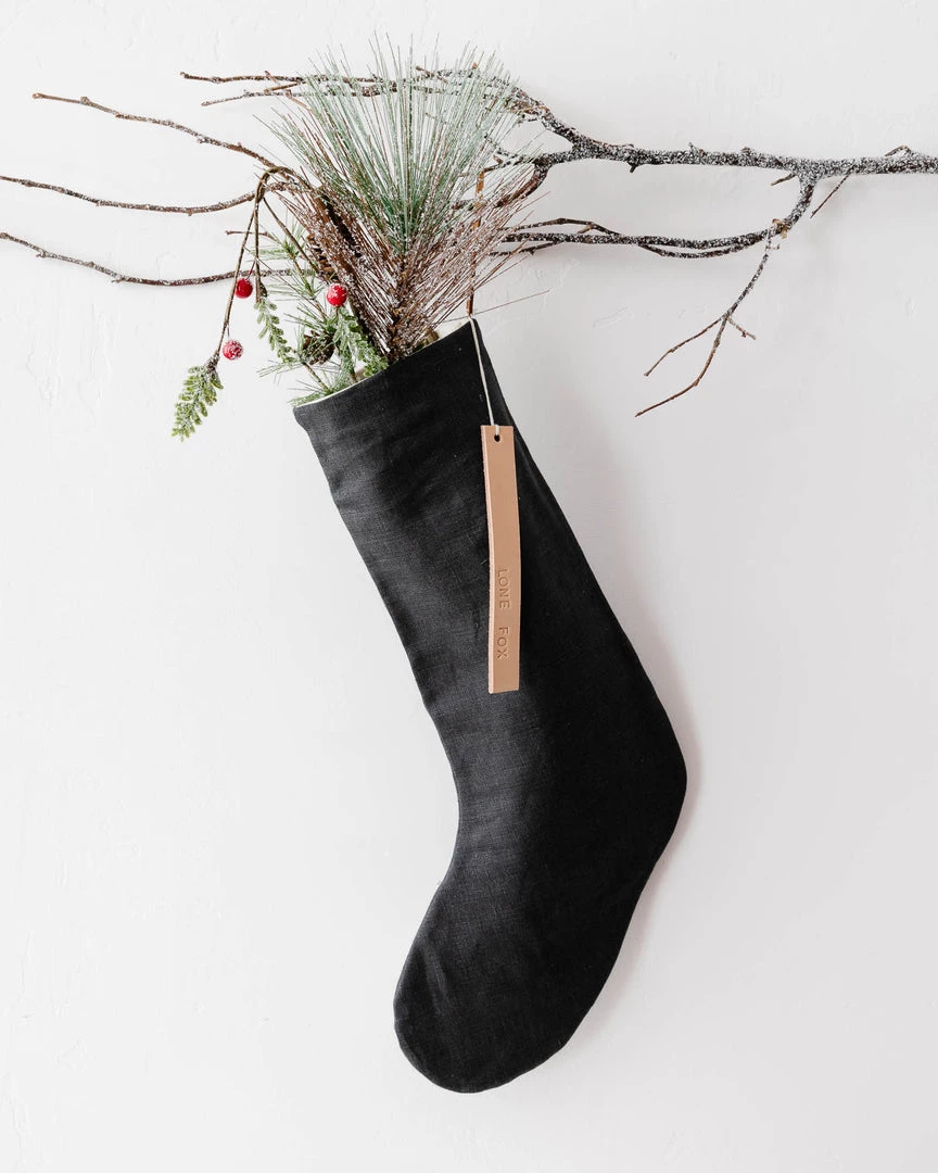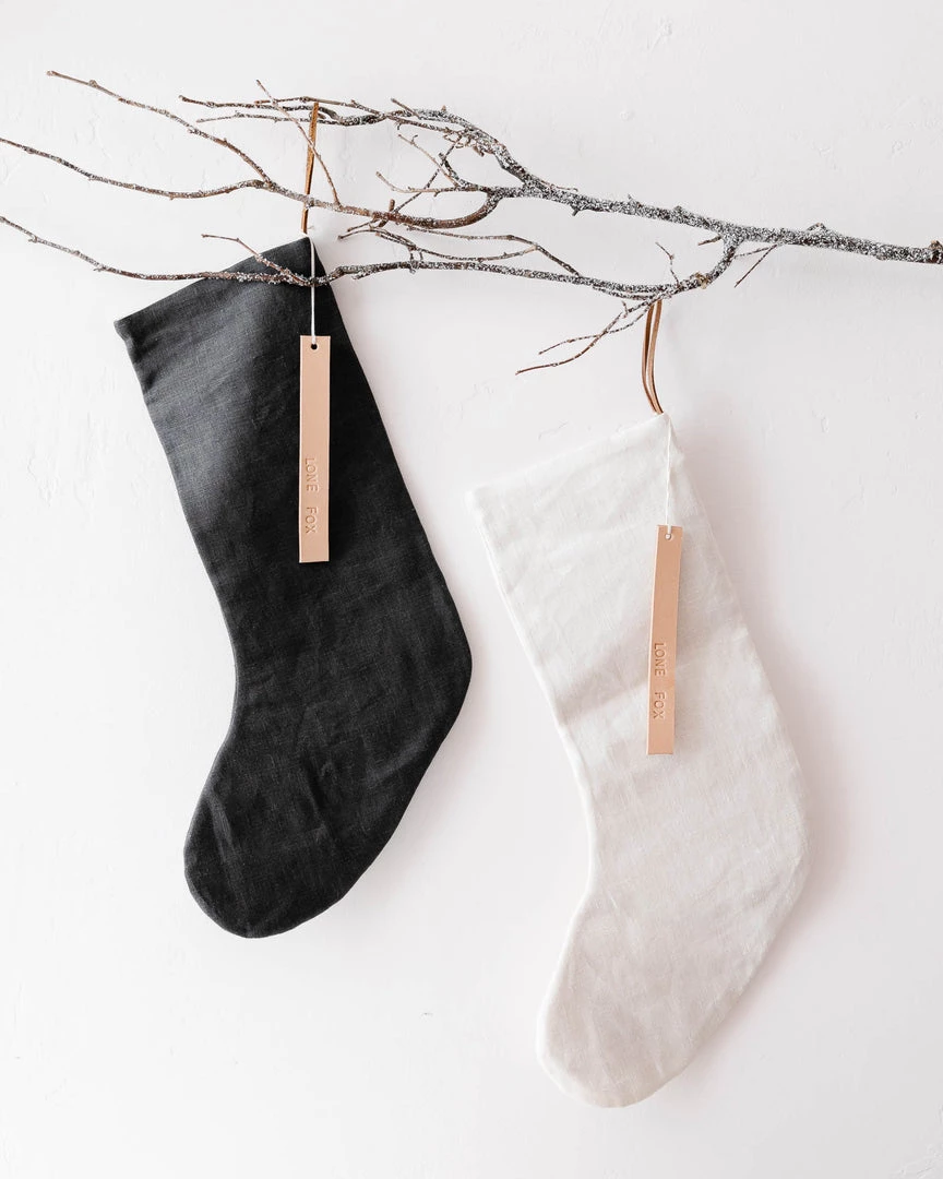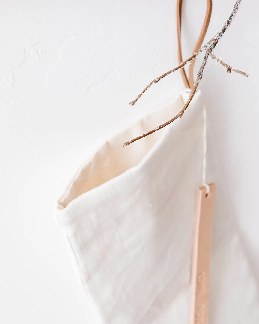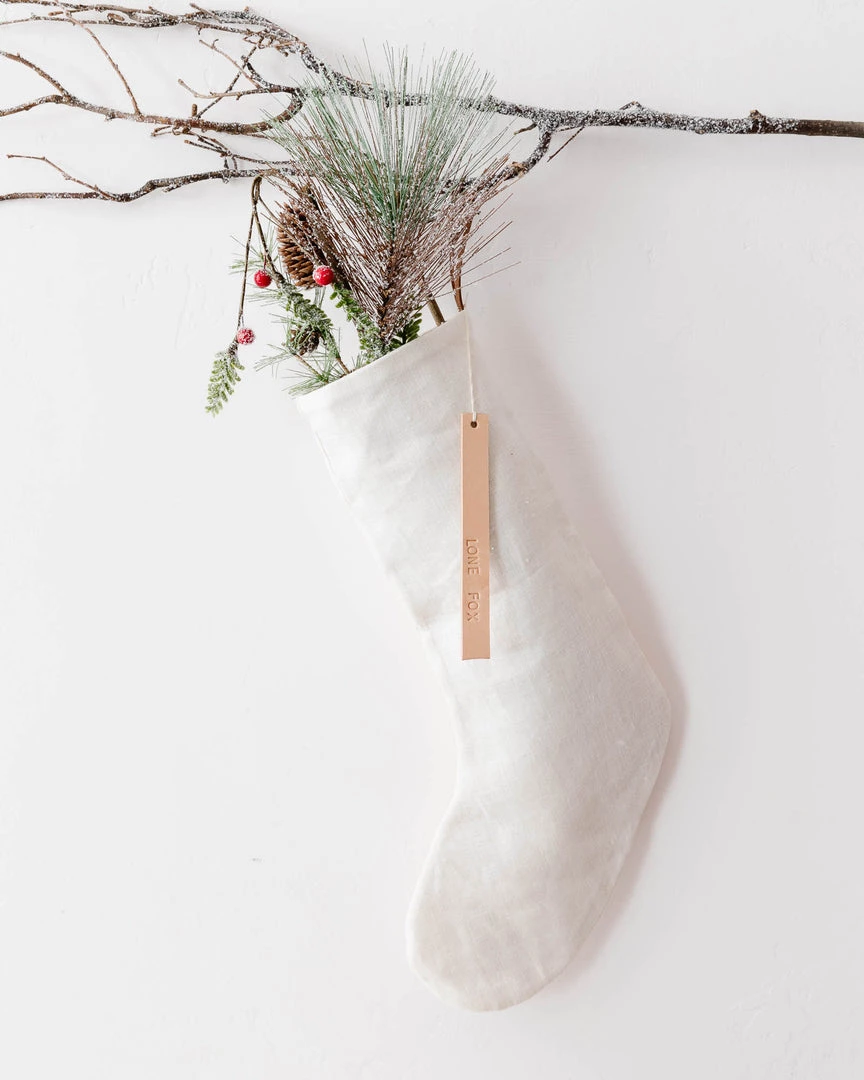 This linen stocking features a hand-pressed “Lone Fox” leather tag for a Personalized look! Crafted from 100% linen, cotton lining and leather loop, this delicate stocking offers plentiful space for tiny surprises.