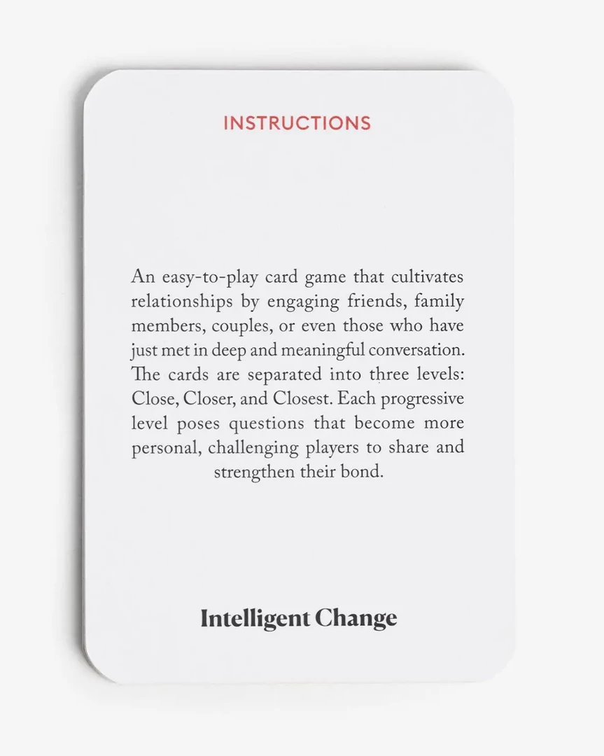 An easy-to-play card game that cultivates relationships by engaging friends, family members, couples, or even those who have just met in deep and meaningful conversations. The cards are separated into three levels: Close, Closer, and Closest. Each progressive level poses questions that become more personal, challenging players to share and strengthen their bond.