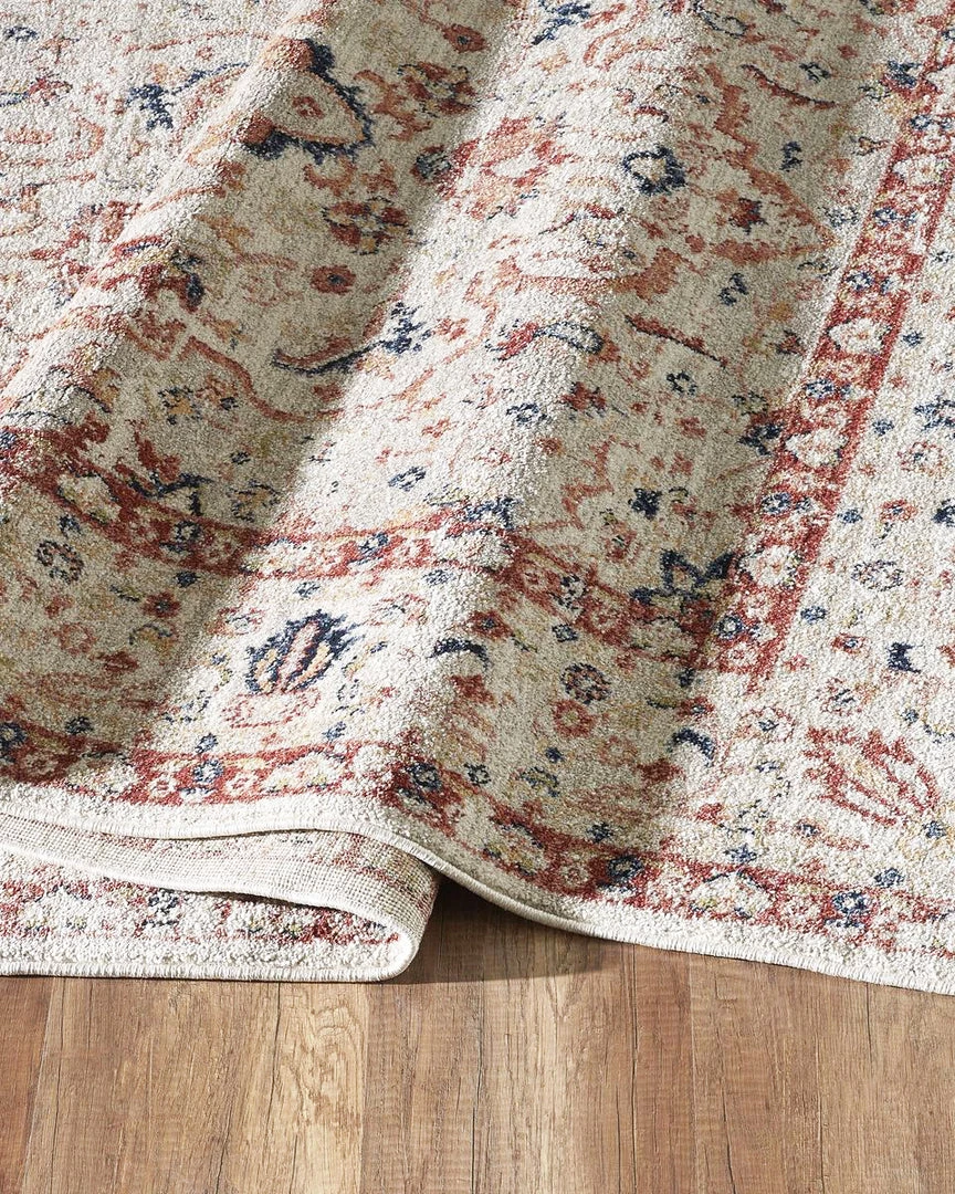 Centered in the middle of this traditional piece is a diamond-shaped medallion that is almost lost in translation, thanks to it’s beige on beige design. Inviting to the eye and highlighting the important peaks of the medallion, is a bright blue color that stuns