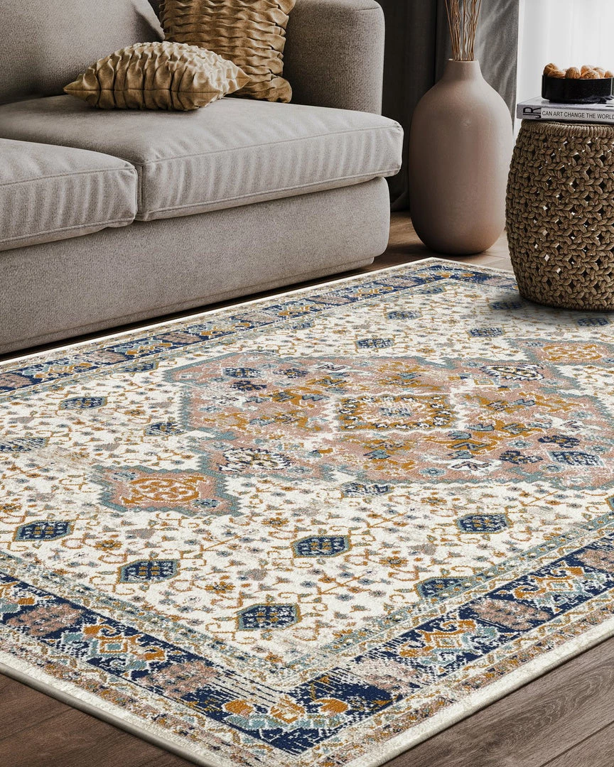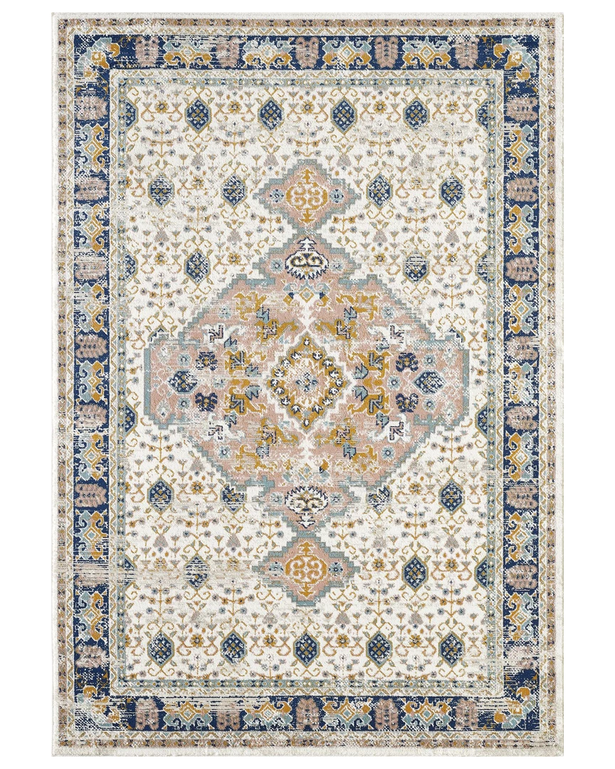 This heirloom-inspired traditional area rug is like taking a step back in time. With the colorful motifs found in Persian and Oriental designers, the patterns in the Porto traditional ivory and orange area rug are truly timeless. Featuring a bold, royal blue border and orange medialians, this is a statement piece that will fit any space in your home