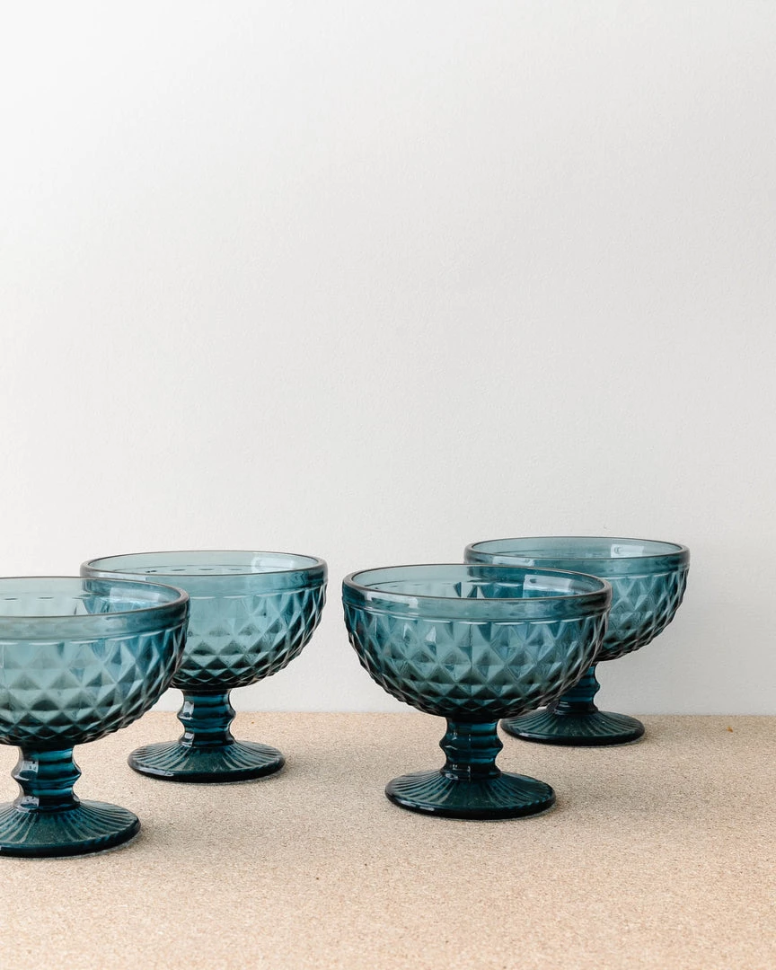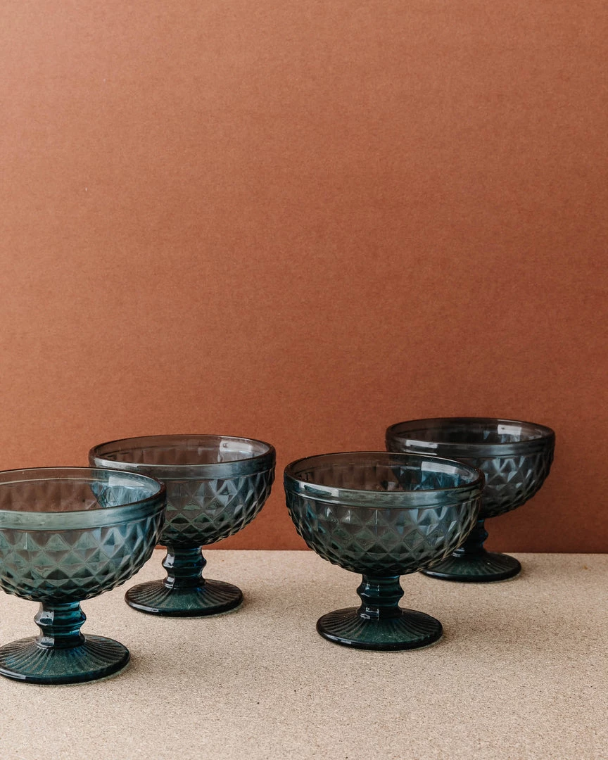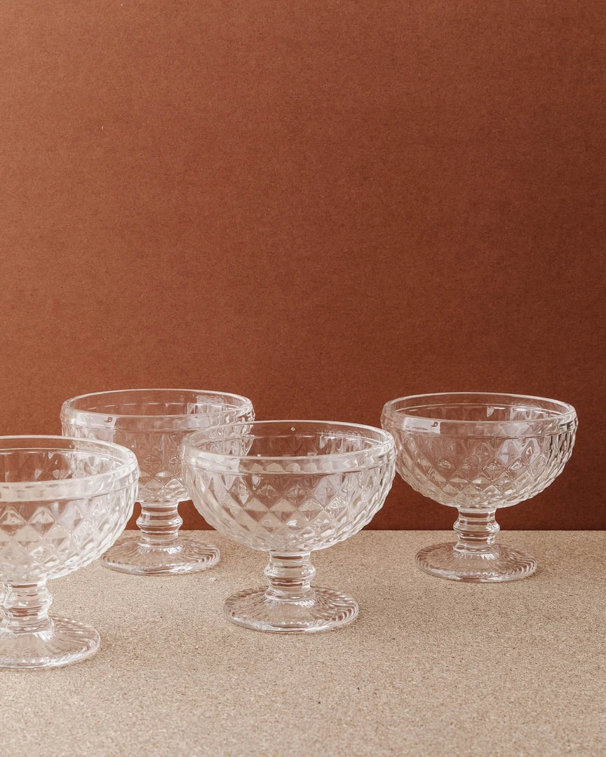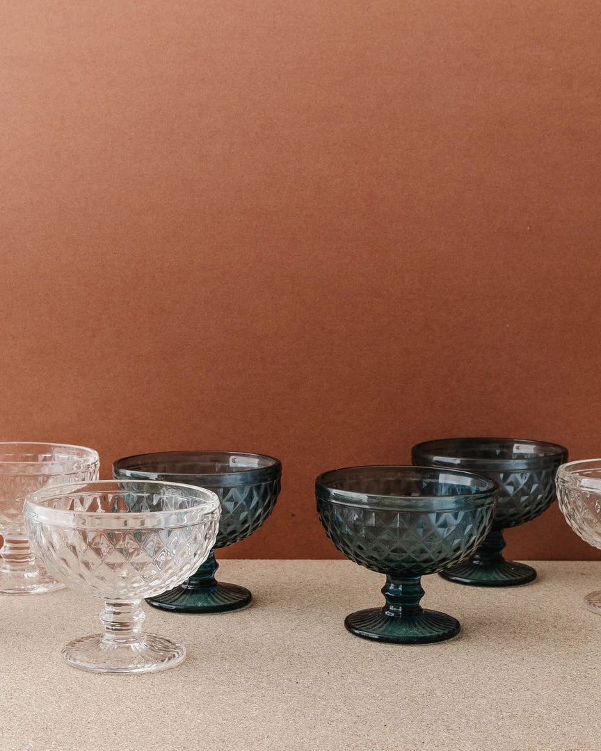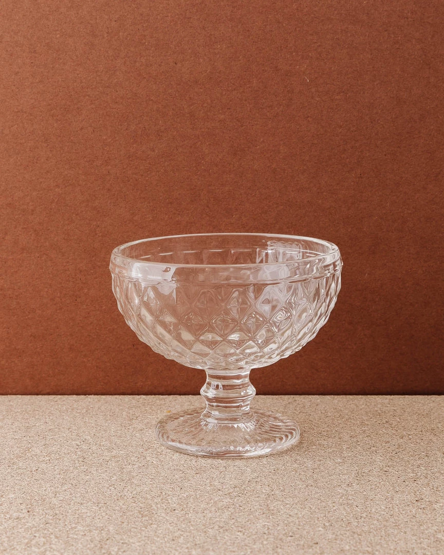 The perfect pedestal bowl for serving ice cream or other small treats. Pressed hatched glass gives these dessert bowls their vintage inspired charm.