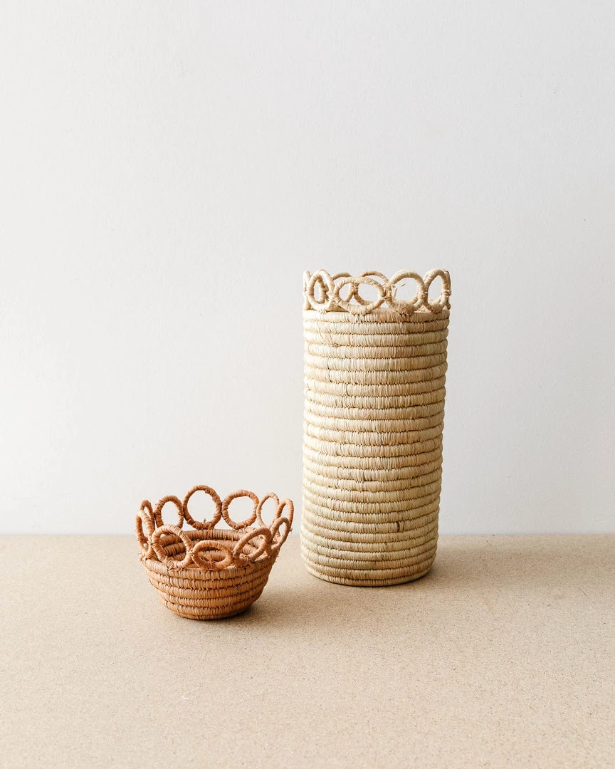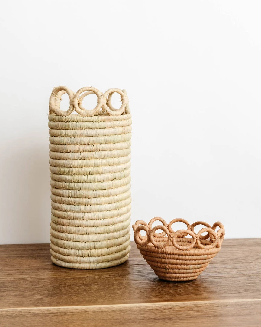 Add a quirky touch to your home decor with these handmade baskets/canisters. Store kitchen utensils in the taller one and small trinkets/coins in the smaller one.