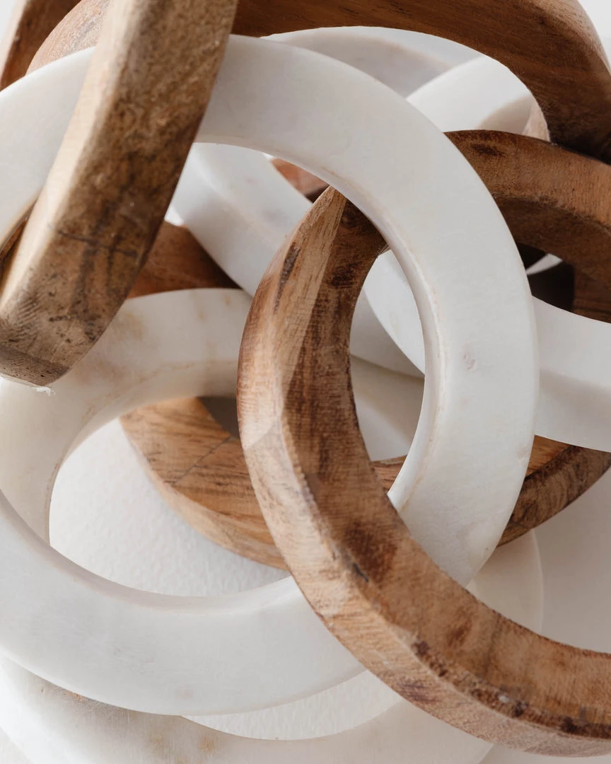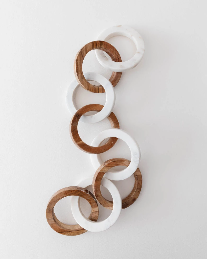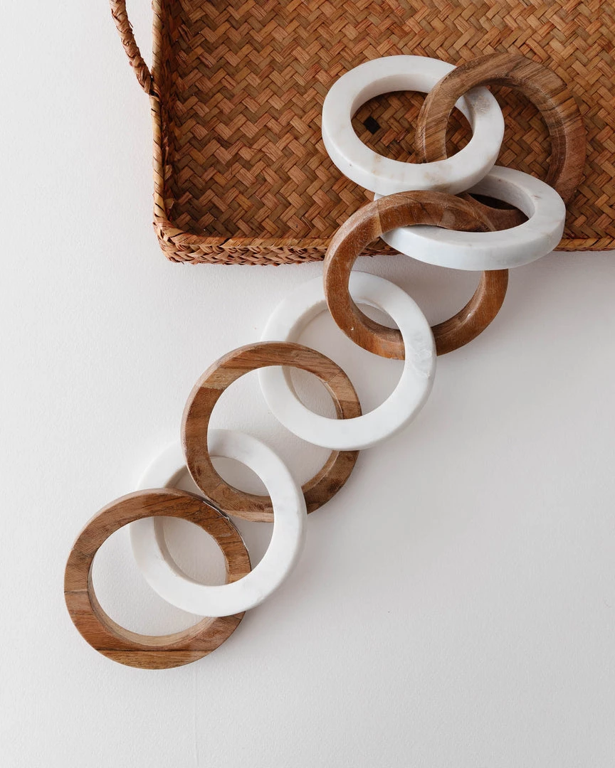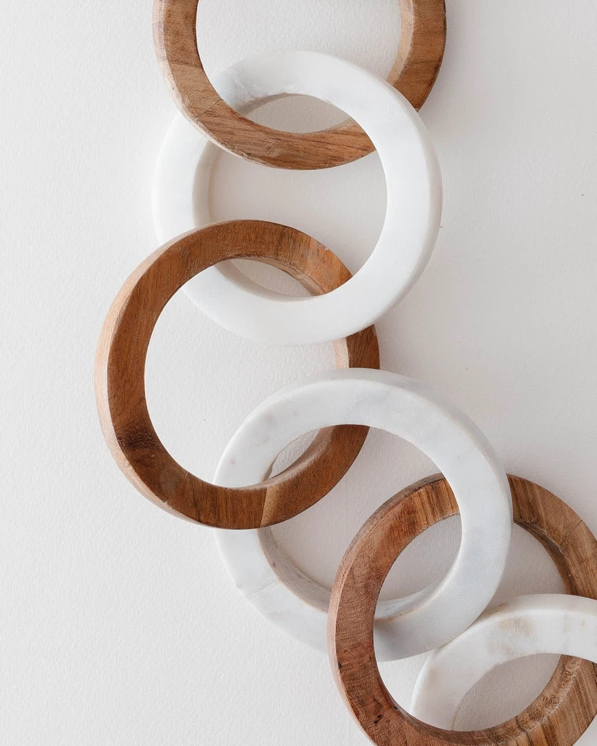 This unique acacia wood and marble chain, adds interest and edge to coffee tables, bookshelves, consoles, etc. Featuring 8 round links this chain is on the longer side and prfect to drape over books or shelves.