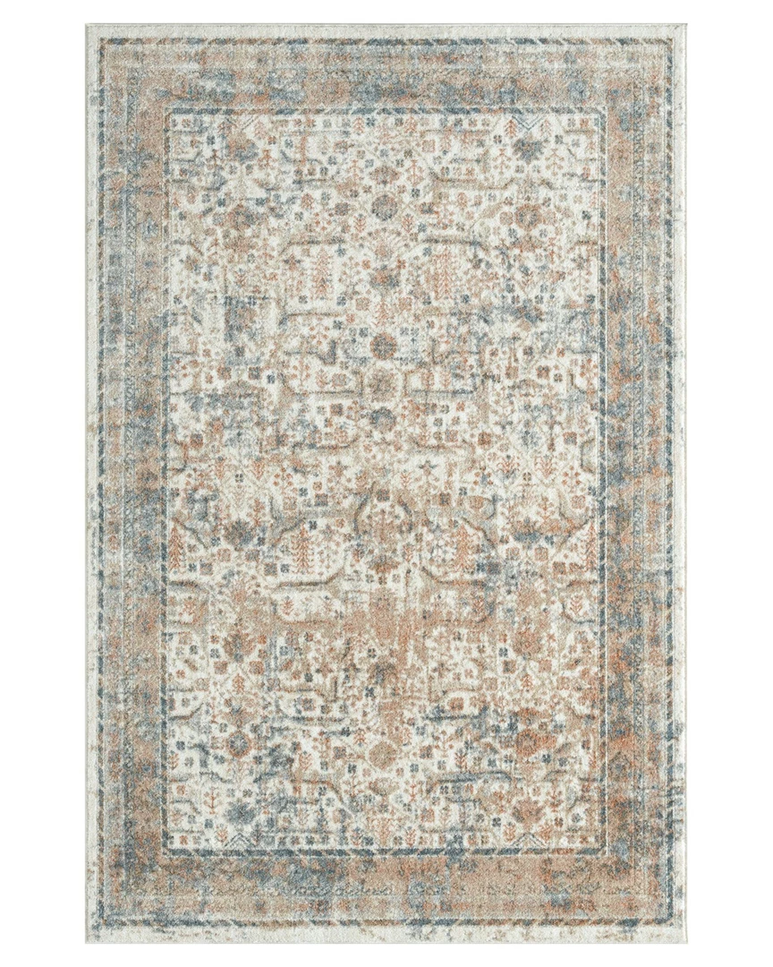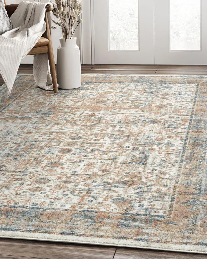 Though the basic shapes are undoubtedly inspired by vintage rugs of the past, the intricate details are entirely unique and on-trend. Bordered by a thick, dark pattern, this is a balanced design that isn’t afraid to hide the real beauty in the smaller details.