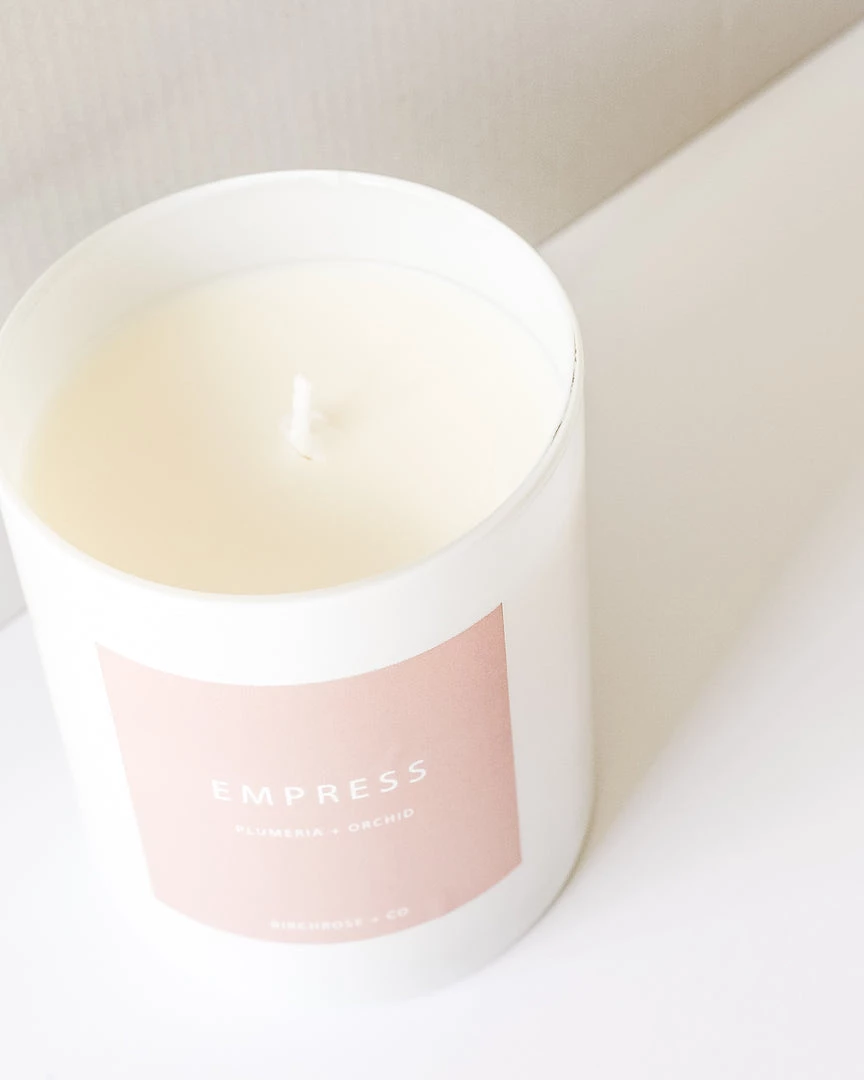 Empress – joyous blend of tropical orchid, sweet plumeria and sea salt. uplifting + bright floral aroma.