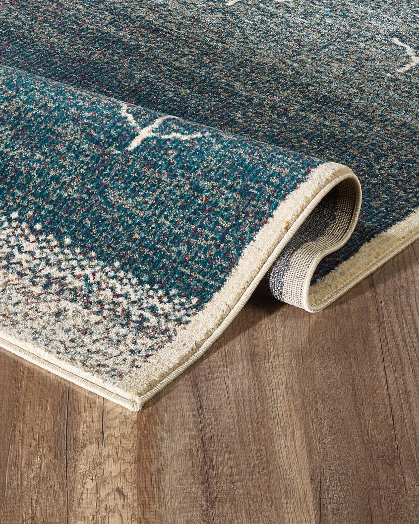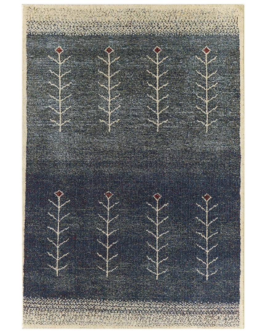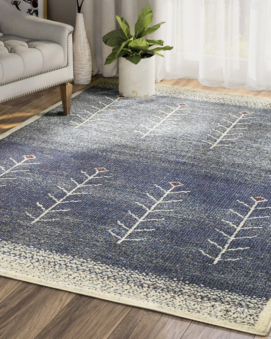 The Kaya blue southwest pattern area rug is inspired by the plains and deserts of the Southwest. In these regions, the culture closely followed the seasons and crop growth. The blue background of this area rug symbolizes the rich vibrancy of planting traditions, while the repeated pattern of plant stalks shows a season of renewal and growth. At the tip of each stalk is a rust red diamond, indicating this is another successful season