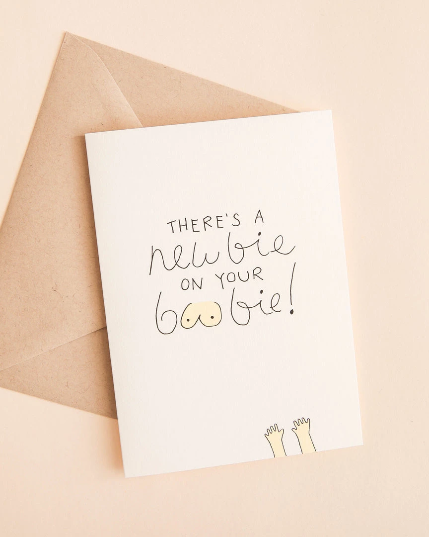 Congratulate someone on their new baby with this, “there’s a newbie on your boobie” blank card! Kraft envelope is included, blank on the inside.
