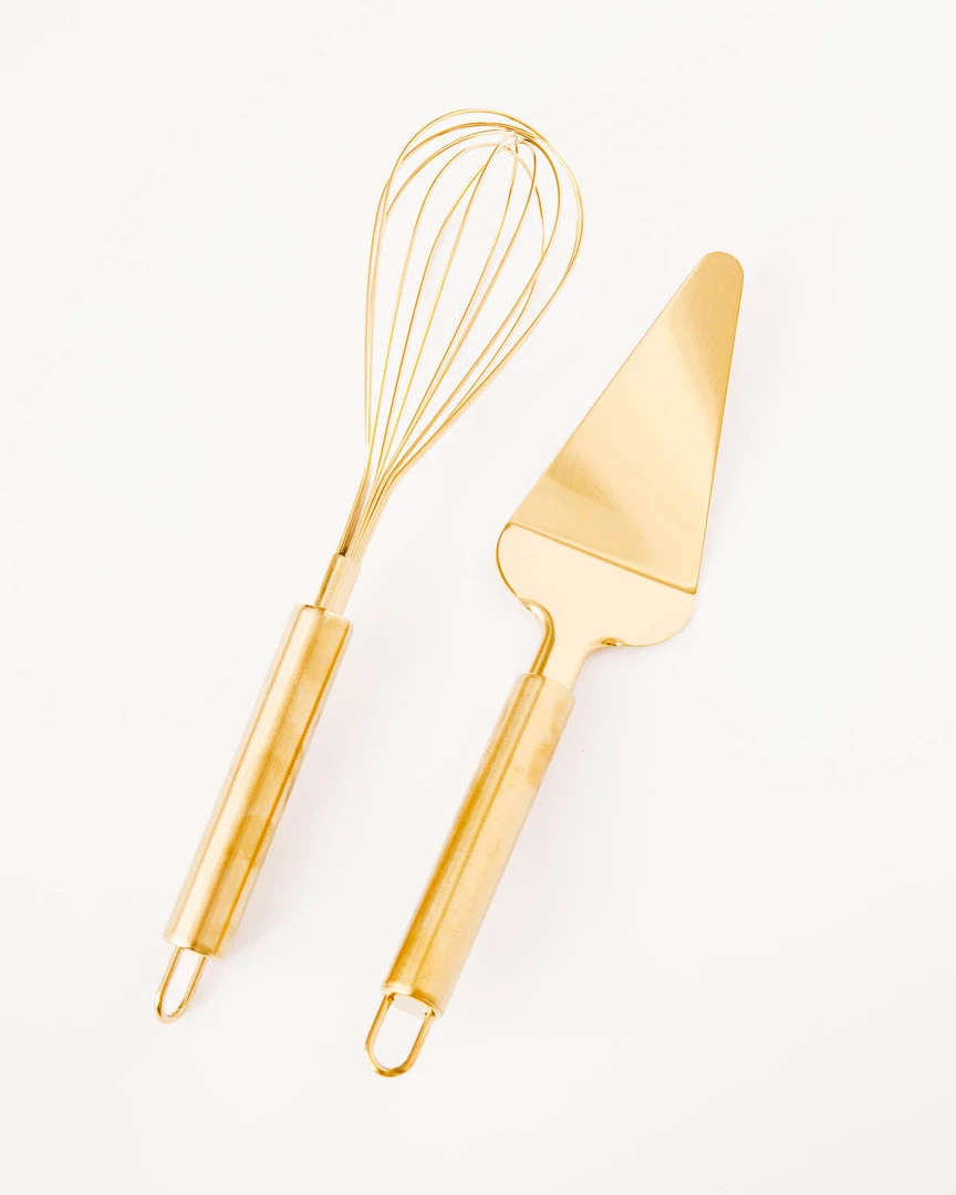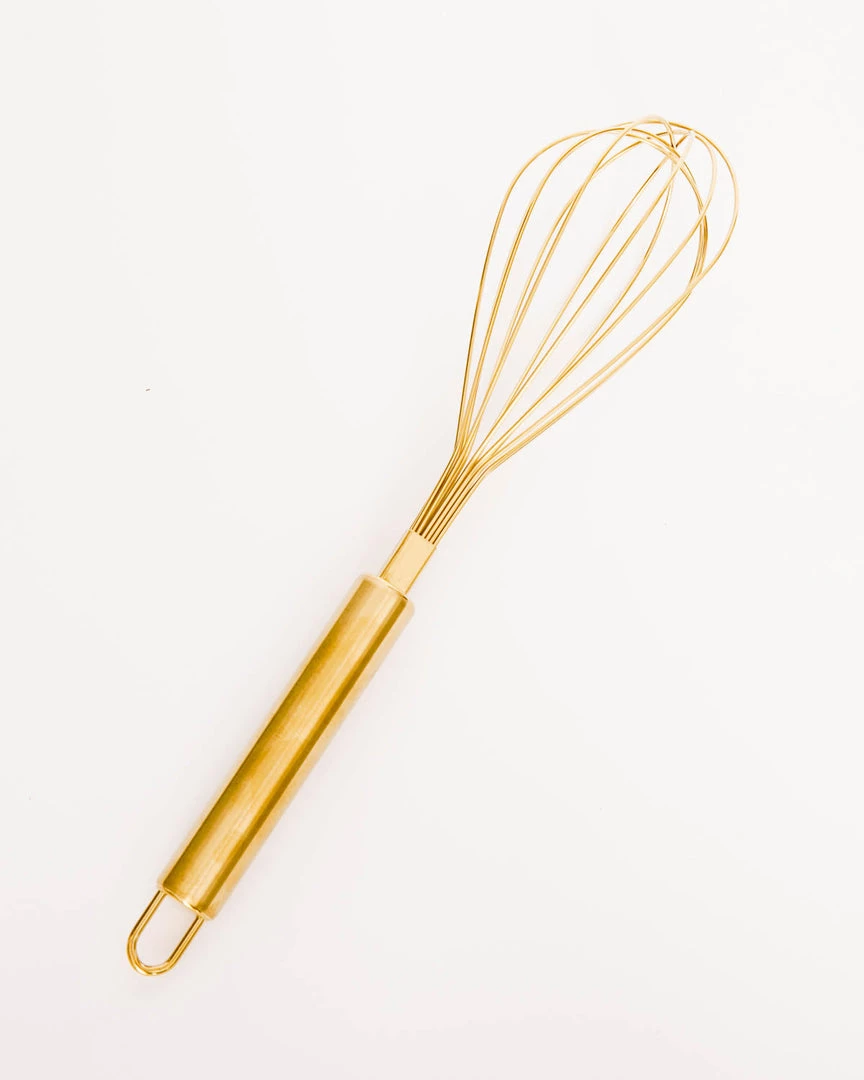 Add a statement to your kitchen collection with this stainless steel brass whisk. Whip up cream or cake batter in style!