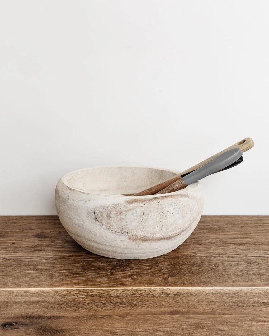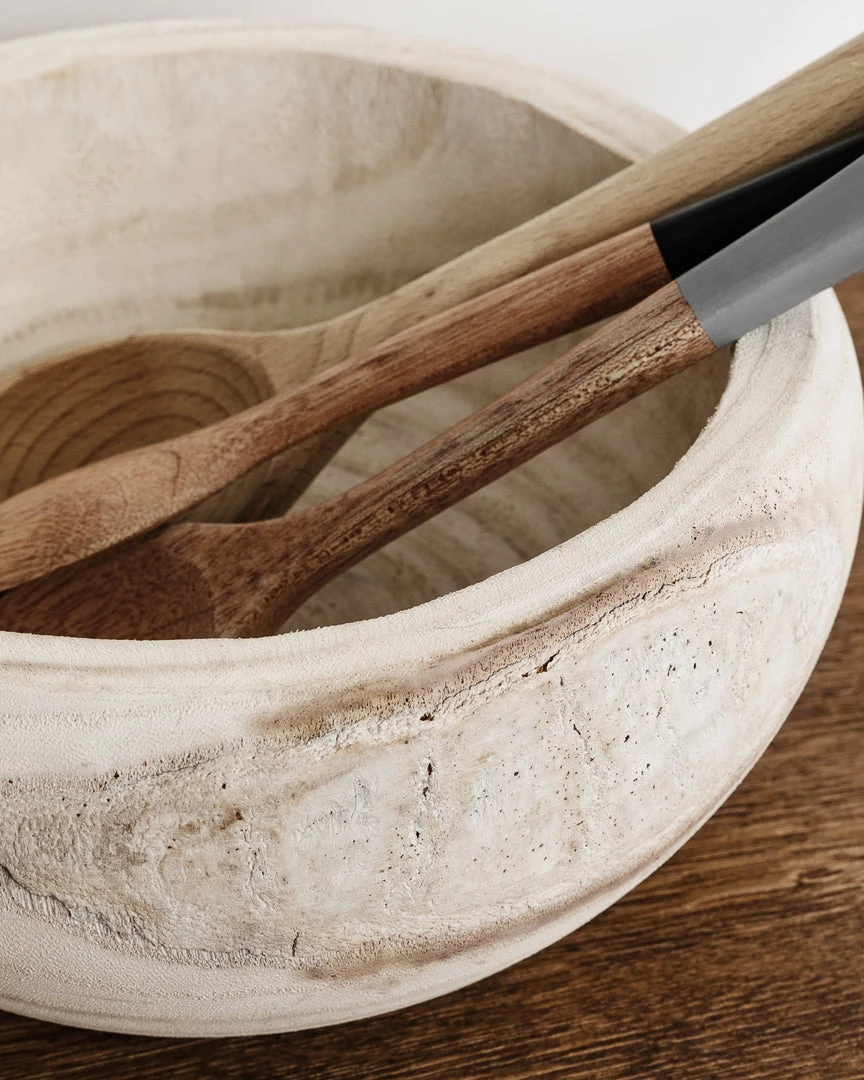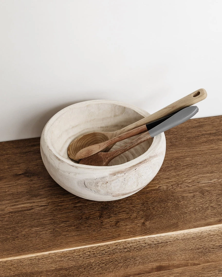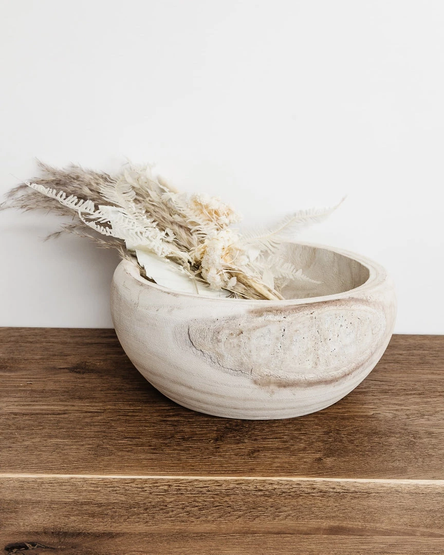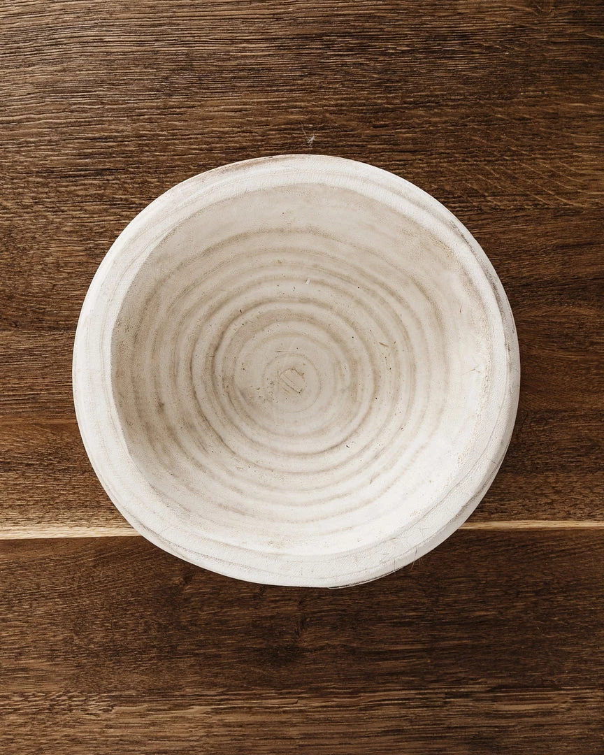 This round shaped bowl has been hand carved and white washed for an organic feel. Think about styling with fruit or placing atop a shelf.