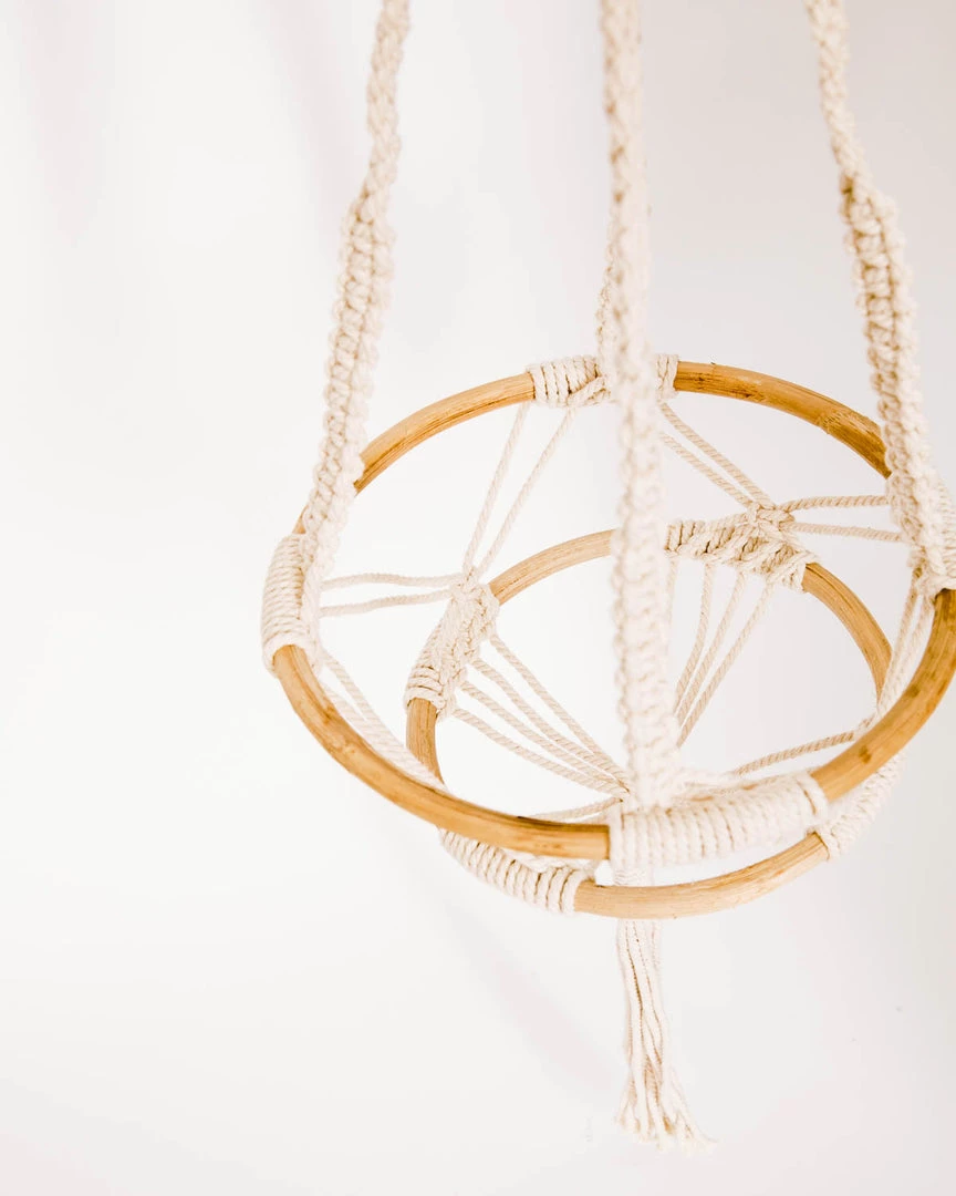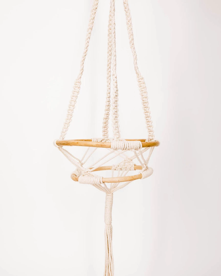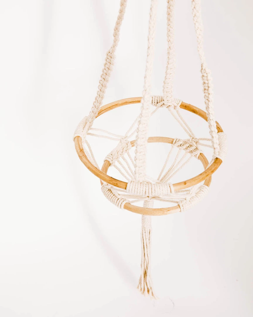 Handwoven macrame between two bamboo rings crates a pretty hanging base for your potted plants. Think about collecting a few and hanging at different heights.