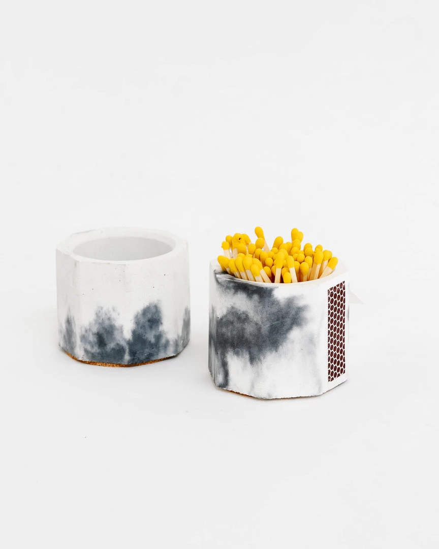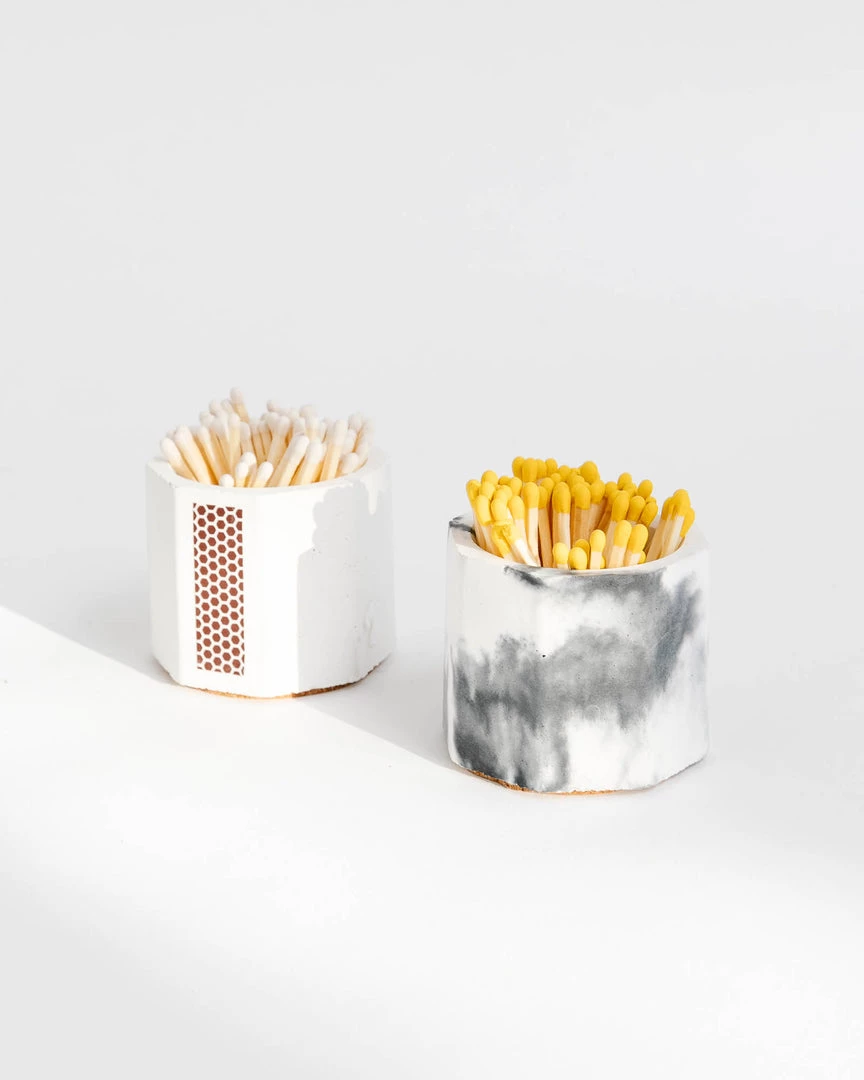 This modern little match holder allows you to strike matches directly on the concrete holder. Complete with matches, it’s the perfect accent for your home or makes a great gift.