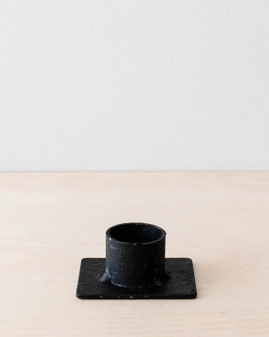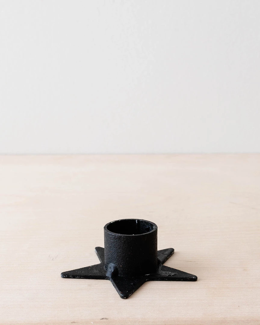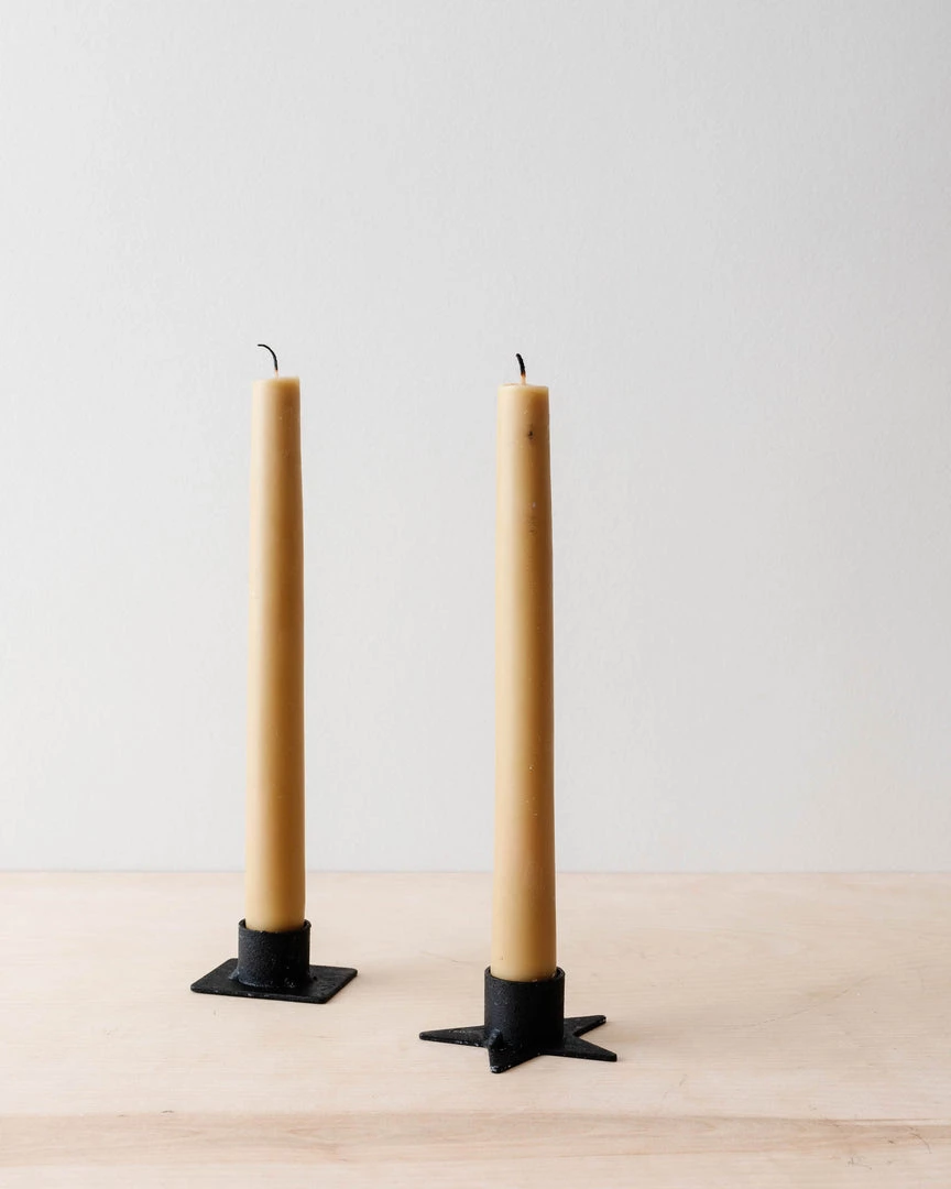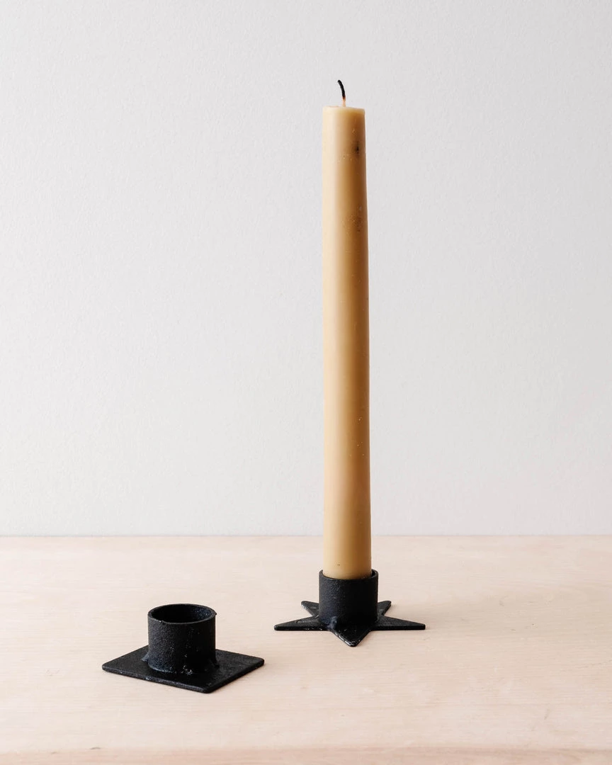 This simple taper holder is the perfect addition to your mantle or table setting. Made out of iron, this piece has a black aged finish and is a sleek addition to any home. Choose between a star or square to let the taper shine (no pun intended).