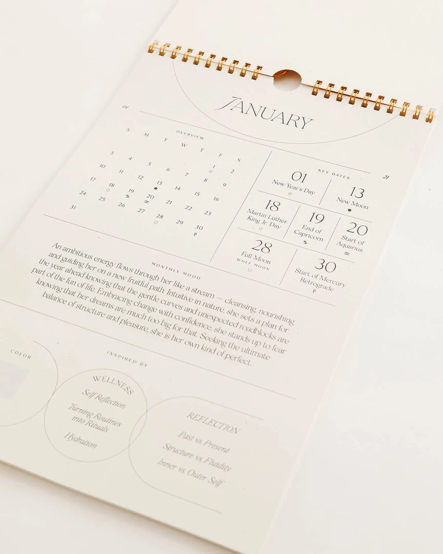 A 12 month calendar that serves as an intentional reminder in your space to be your best inspired self for the month ahead.